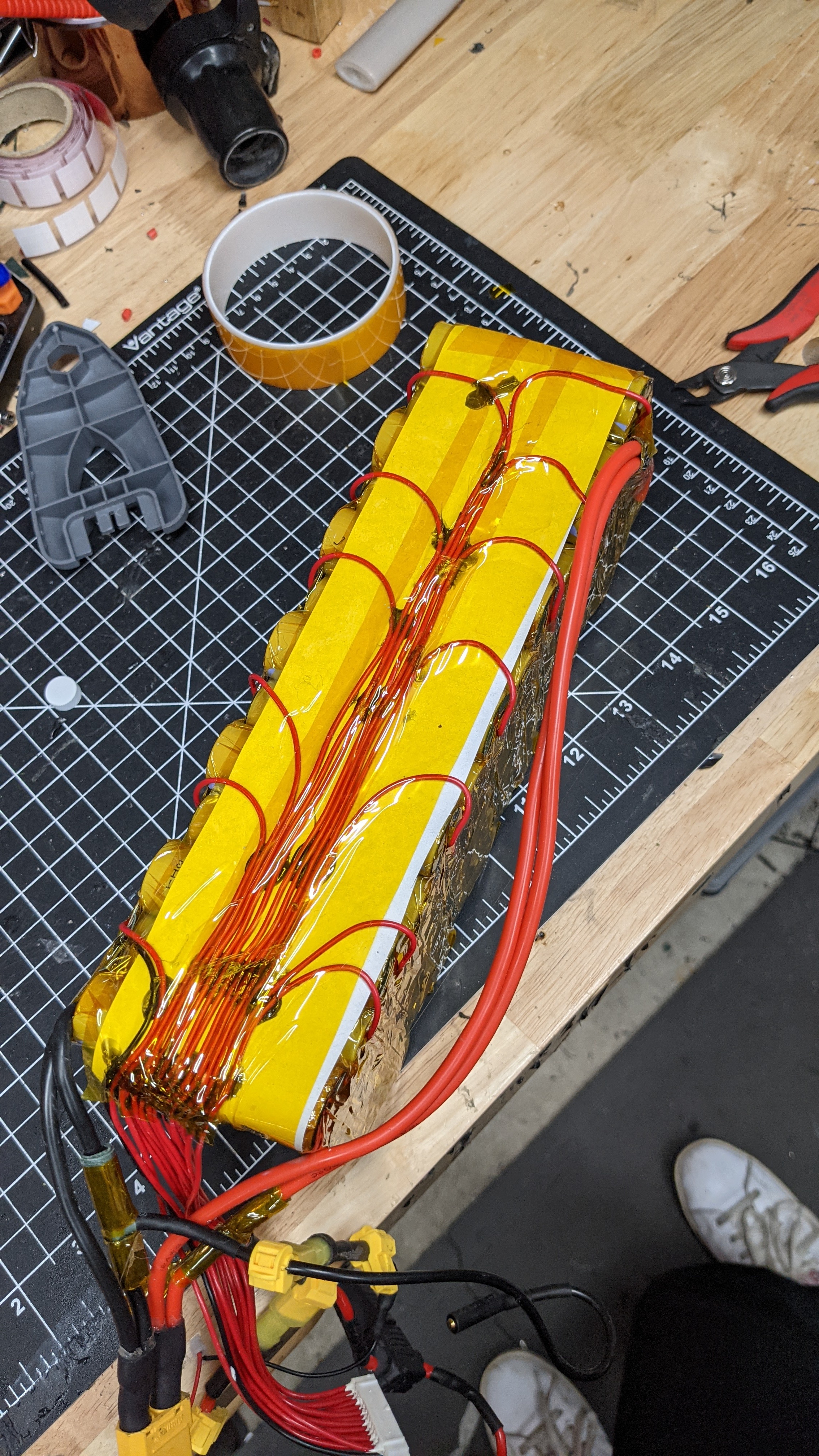 A spare 12s6p P42A battery for a Lacroix. This is a hot swap situation, NOT a charge and ride. There is a single loop key that can go into either the board (in board power) or in the box (external power). Since there is only one key, the two batteries can never be connected in parallel. This reduces the chances of damage from a voltage difference. This route required two ports be added to the board.