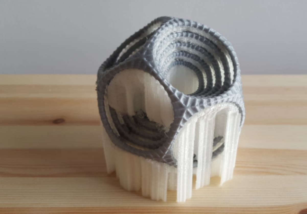 And heres a good example of using dual extruders to print PVA supports (which are water soluble) This print will be submerged in water afterwards and the support material will melt away leaving the model left behind