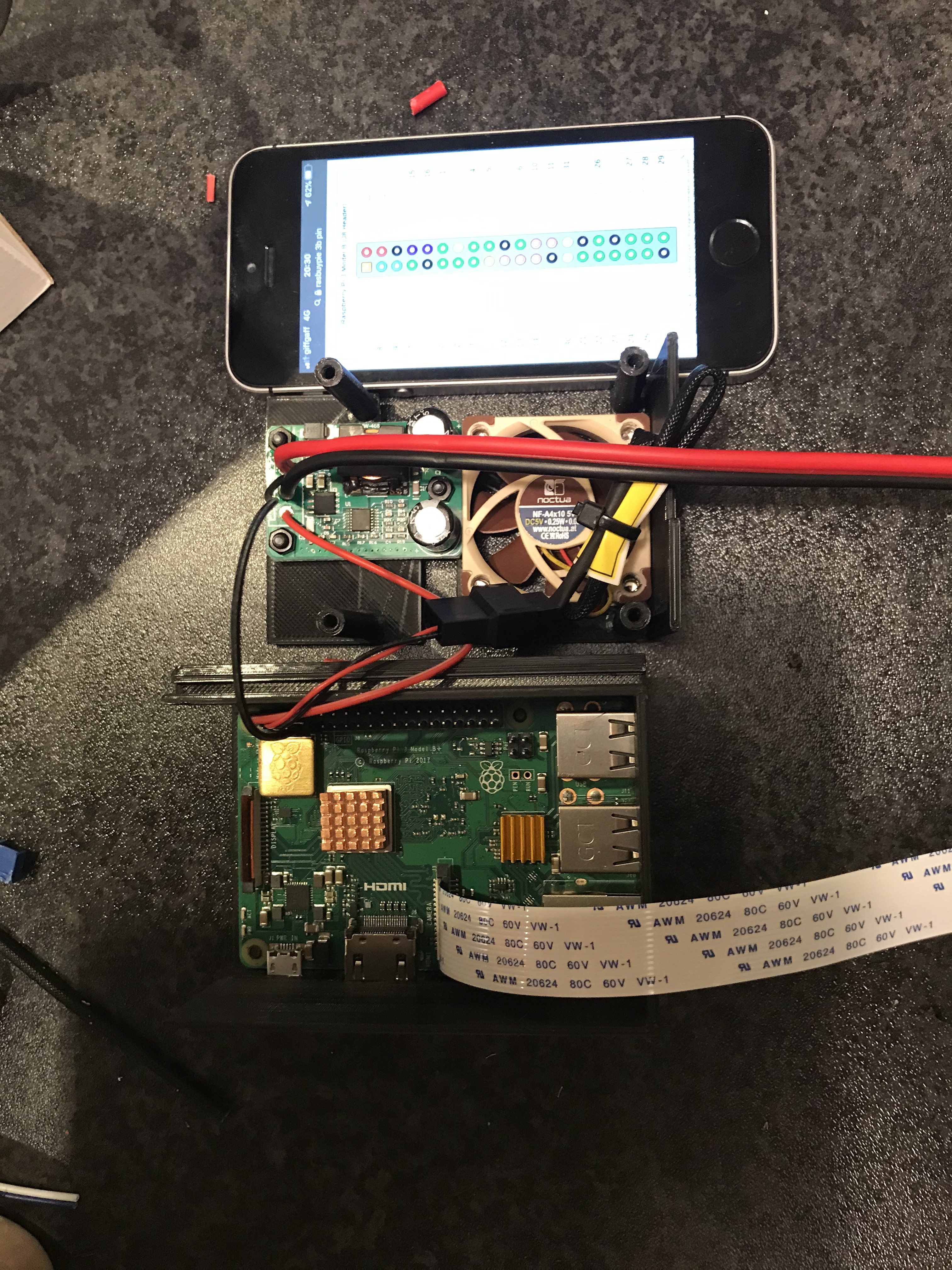 buck converter on the rasbury pie to power it off the printer power supply. heatsinks and fan to cool it down as it was hiting thermal and under clocking it’s self and mounted it in case to mount on the printer.