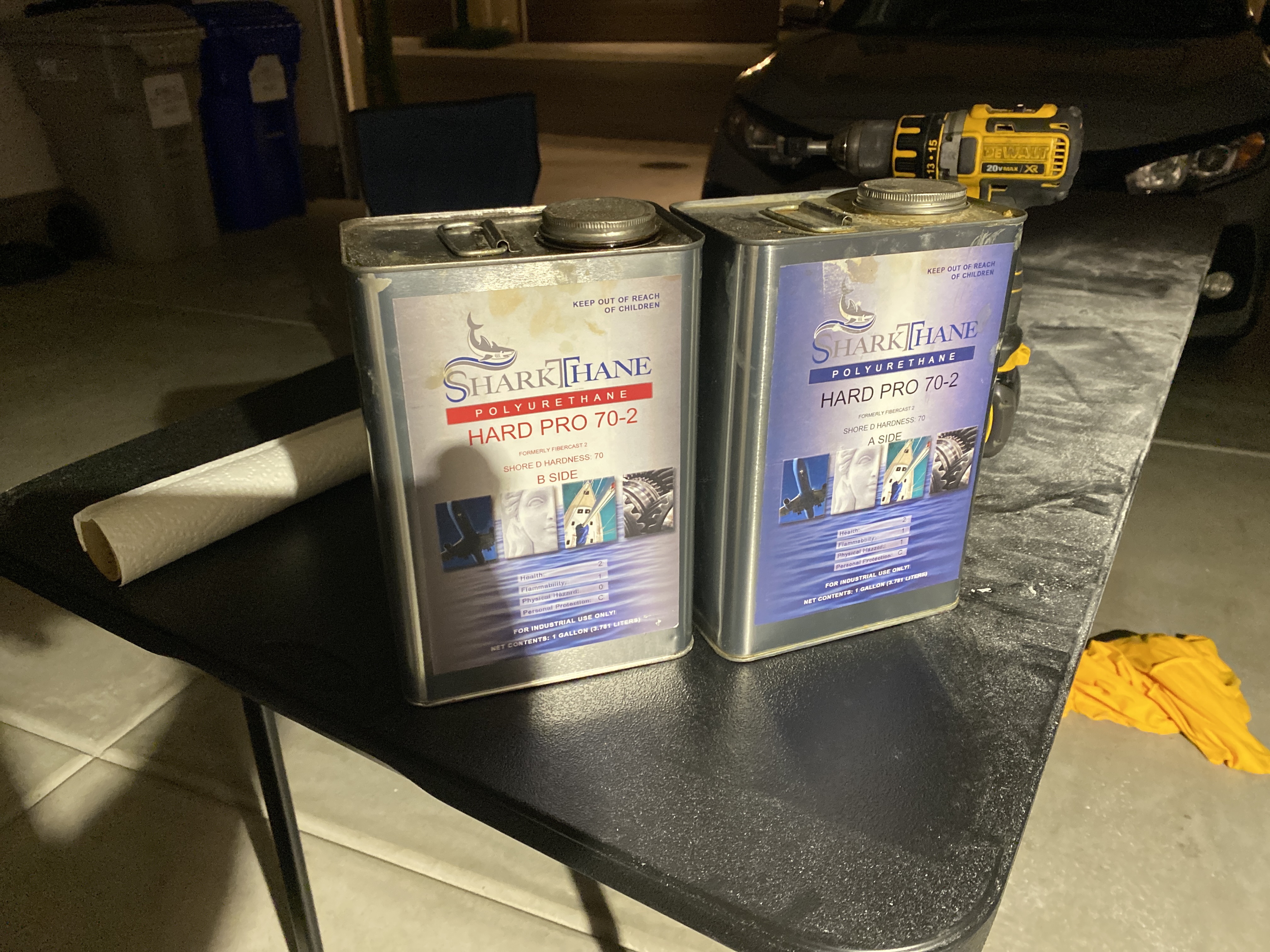 It was a two part resin. “Sharkthane”. Sets in 5 mins, cures in 1-2 hrs.