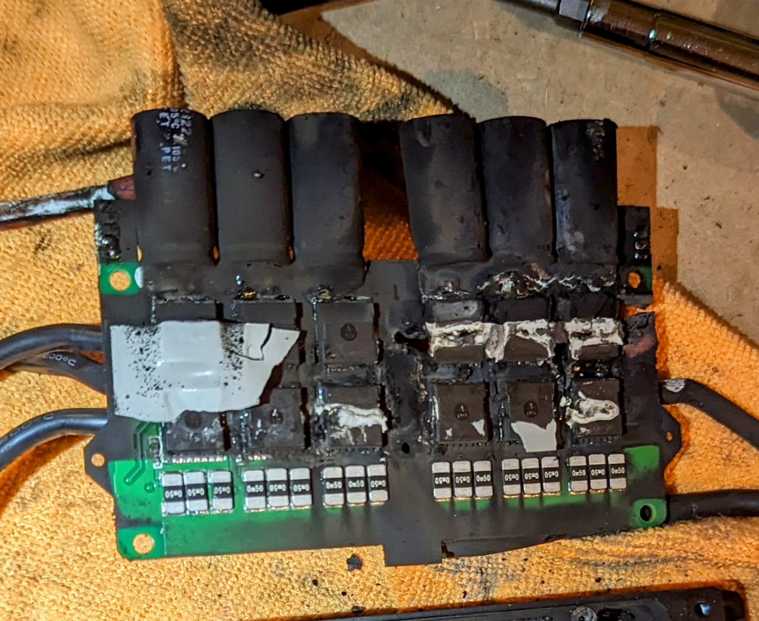 Ok, so it was probably running something around 70-75 bat and 90A motor per side… But it was like that for about 3 months with no issues and some really hard riding… This time I started ripping up a hill and about 50 feet in the board cut out and then the wheels turned like they were stuck in mud… It wasn’t a normal fault… What should I look for in this autopsy?