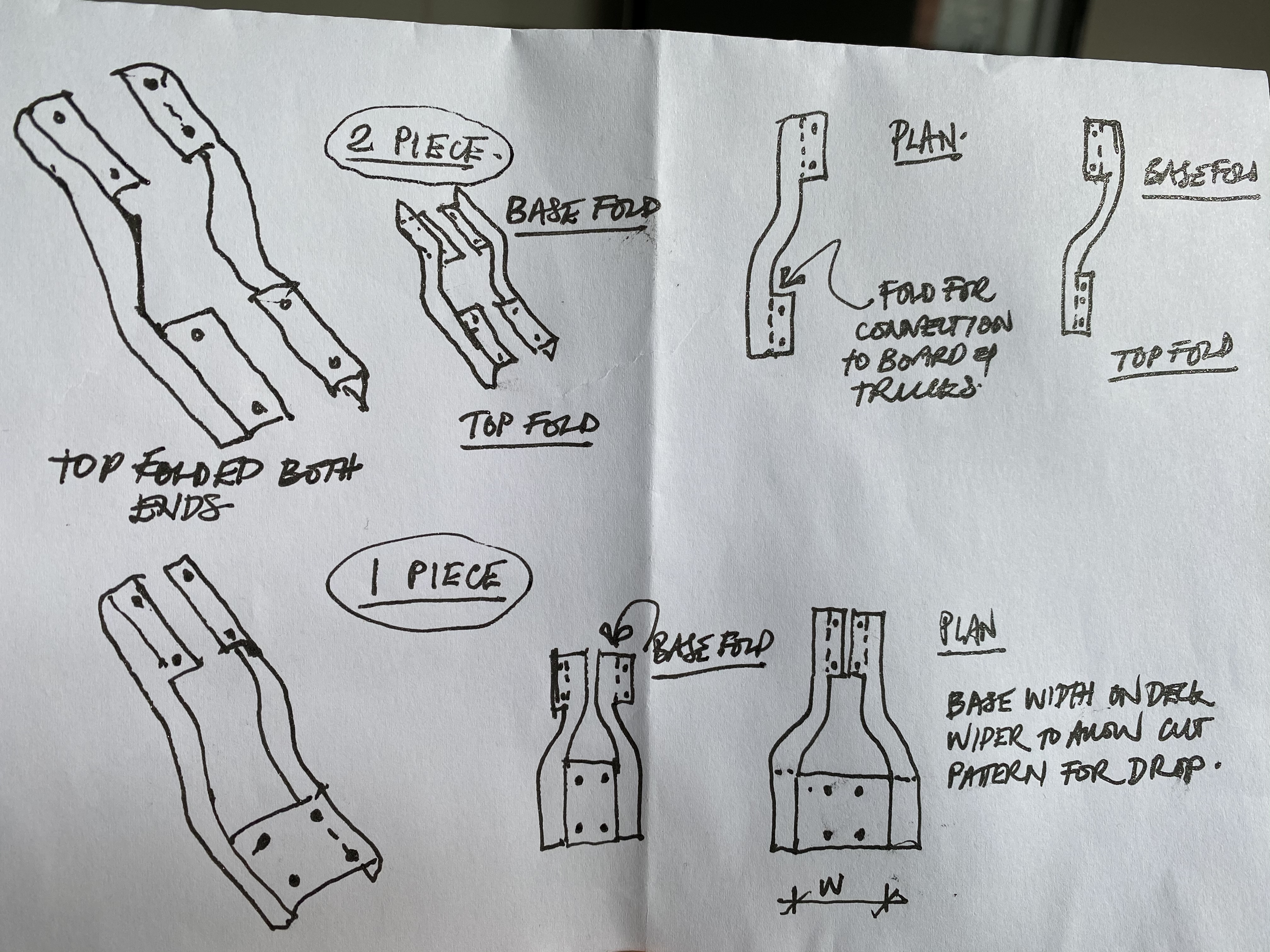 Cut the vertical part to shape, to form the dropped shape with folded tabs to form the connection for truck and deck. Drill the folded tabs for mounting points.?