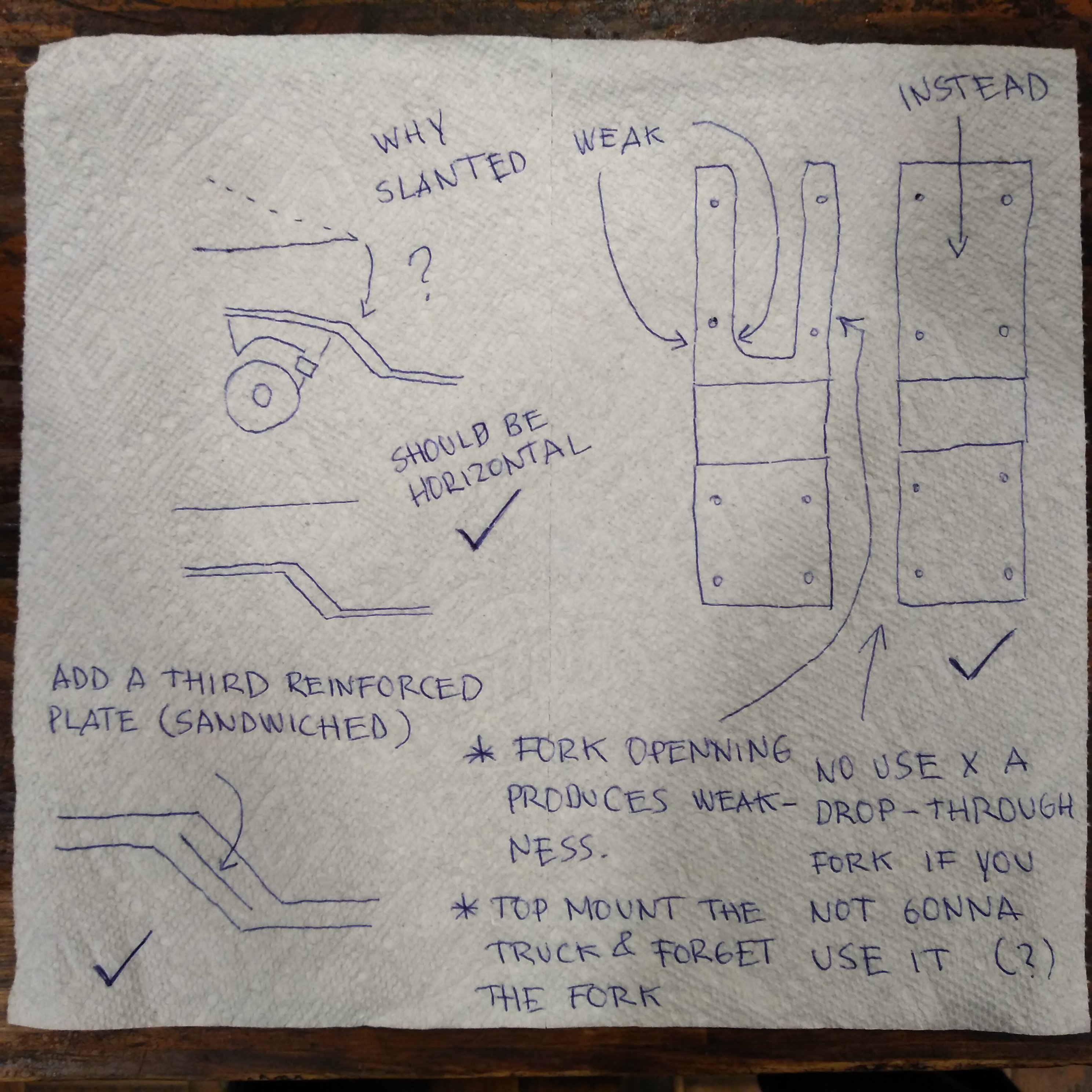 Three things I see different here: a) the drop is more steep now and a little short; b) the tunning fork is short; and c) the holes are drilled closer to the bend. These should technically improve the structural strength of the design .