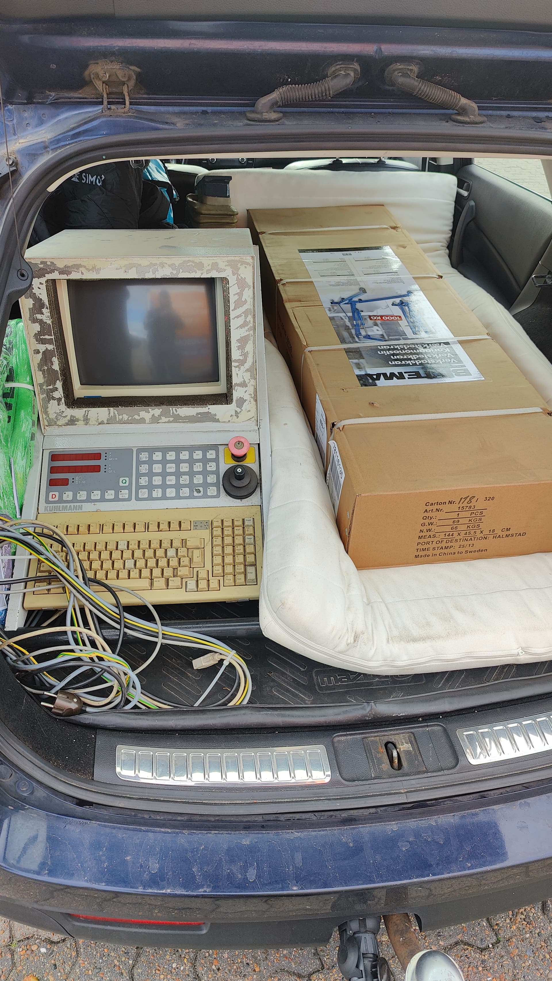 It’s a CNC engraver from 1988, called the Kuhlmann Prokomat P20T and it has 400x400x100 travel. New price (in 1988) was 65000€, I paid 1400+ had to transport it myself (this is harder than it seems). It’s semi disassembled. It’s an engraving machine not a mill (technically), which is something that I plan to address. But first, story time about how I acquired it!