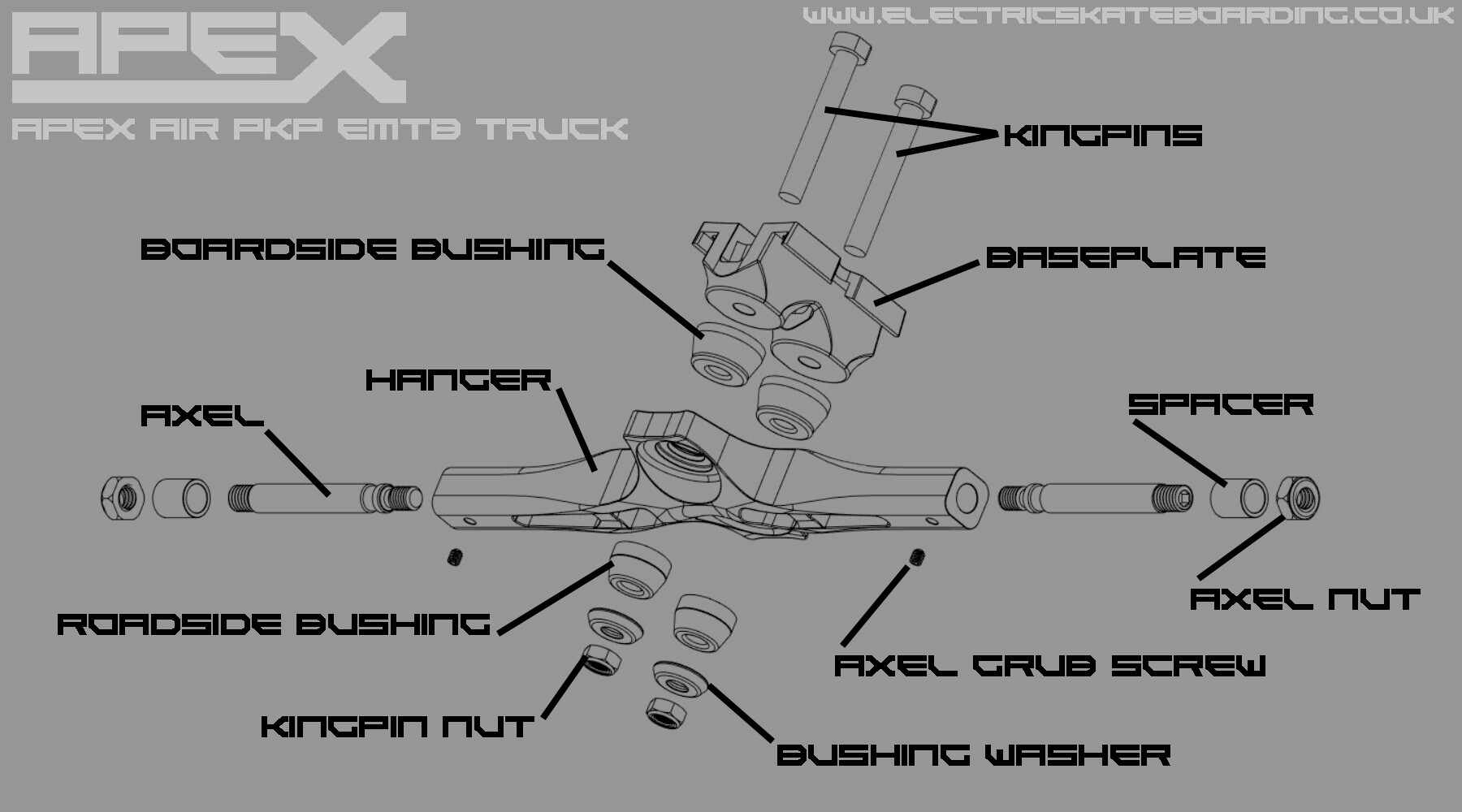 Kingpin - Traditionally this is the main bolt in the center of the truck. The PKP truck has 2 kingpins that are mounted in parallel to each other. They slide into the baseplate from above.