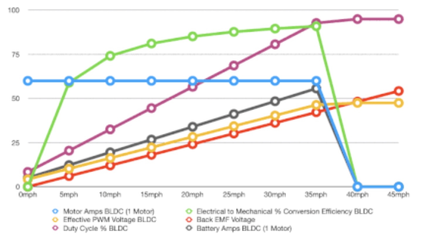 ^blue line is the motor current and black line is the battery current… it can be seen that it takes less battery current to supply the same motor current at lower speeds and torque is directly proportionally to the motor current… no load speed is where the red line crosses above the yellow line.
