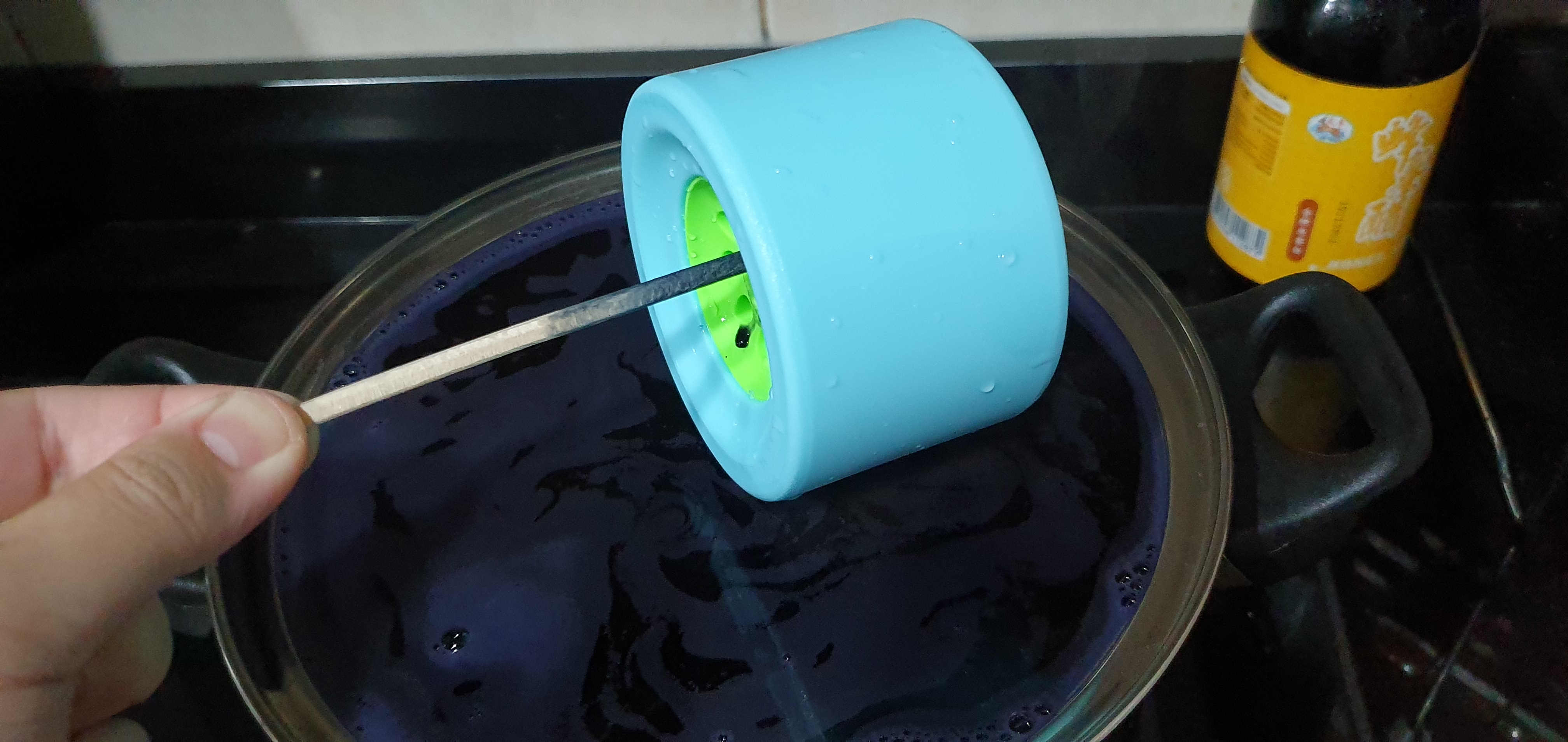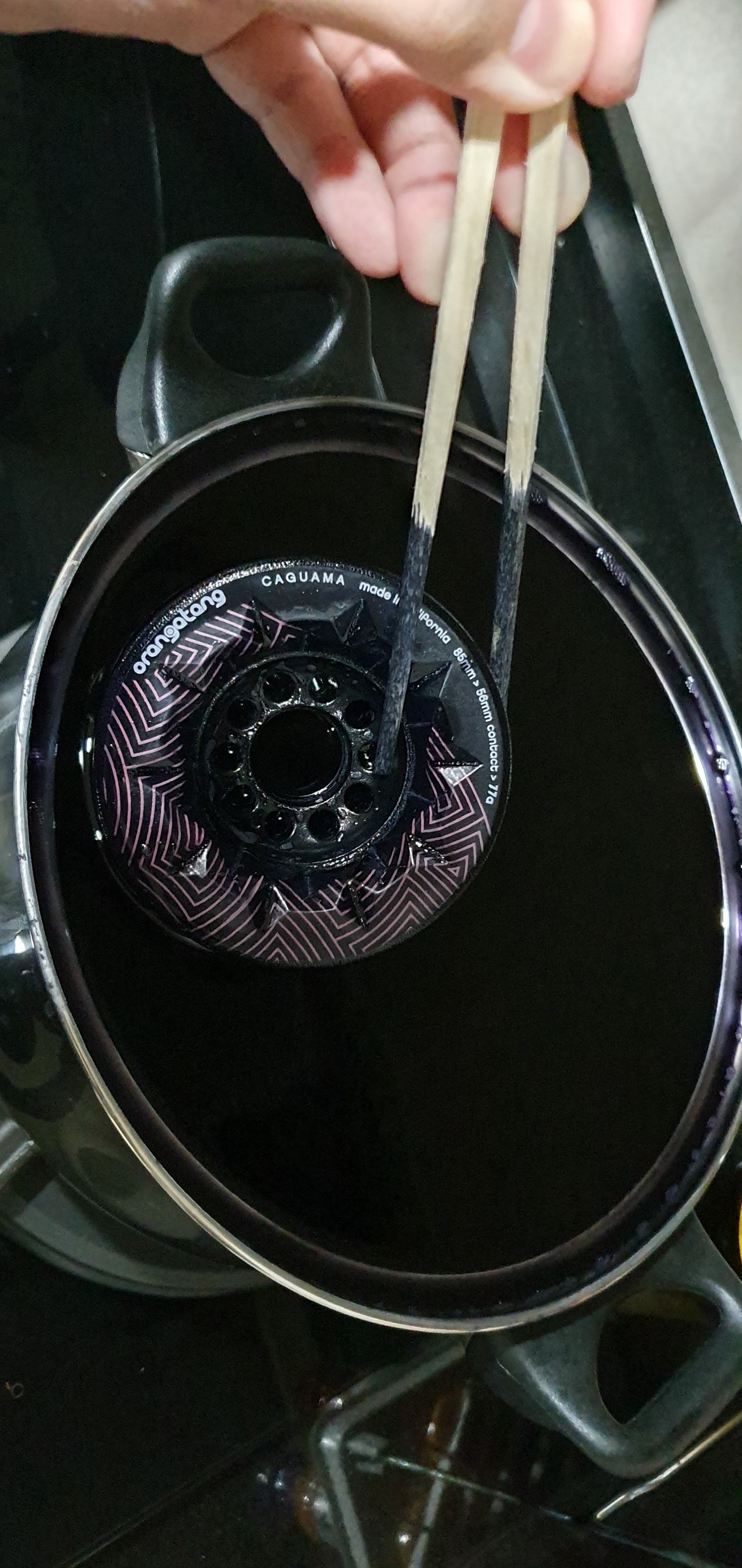 Off the stove, dump your wheels etc in, and let it sit in there. The longer the better, I left mine for an hour. Turn the stove on with low heat to heat it up if it starts to cool down, but make sure to stir occasionally.