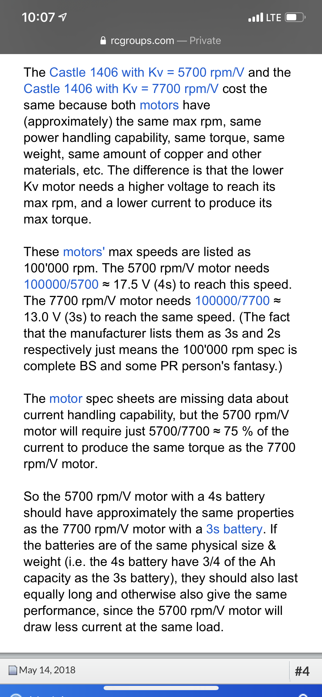 This however is kind of unlikely. Let’s say for the 170KV, I choose 10S, that would mean the 800KV would need 10S * 17/80 or roughtly 2S. Conversely, if you choose 6S for the 800KV, you would need 6S * 80/17 or roughly 28S. You can see how difficult this would be to achieve with batteries. A much more economical and arguable safer way to achieve same speed would be through gearing. This is assuming that the motors don’t just choke on torque and are able to attain max KV (ie mythical perfect motors. Will never be the case). This is also assuming that all other motor characteristics are equivalent or very similar.