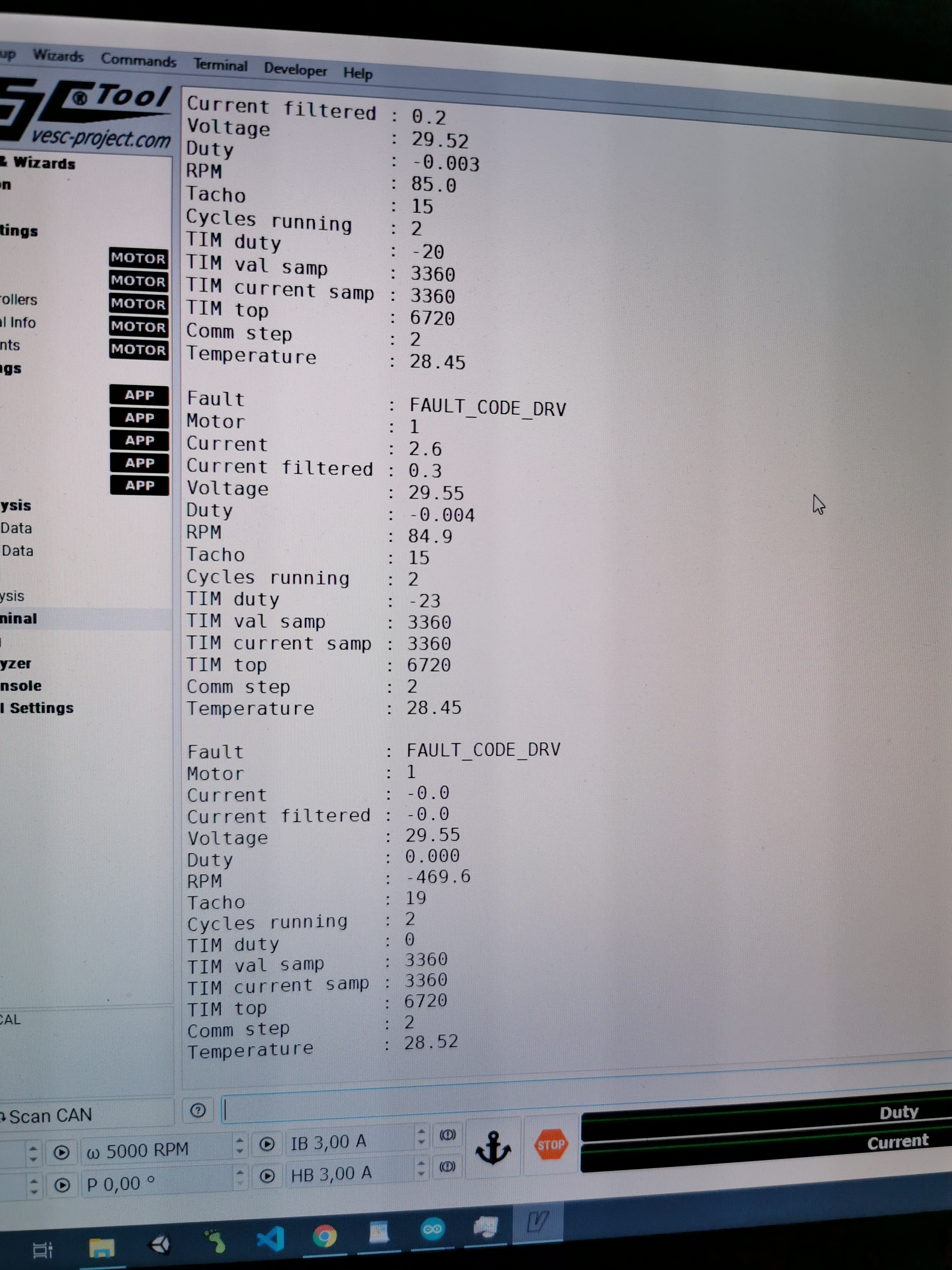 So it starts blinking red 3 times in some sort of period… Blue and green are constantly on. I got a really weird low pitch sound for 1 sec on the motor, THEN VESC Tool said Could not measure the motor resistance and inductance