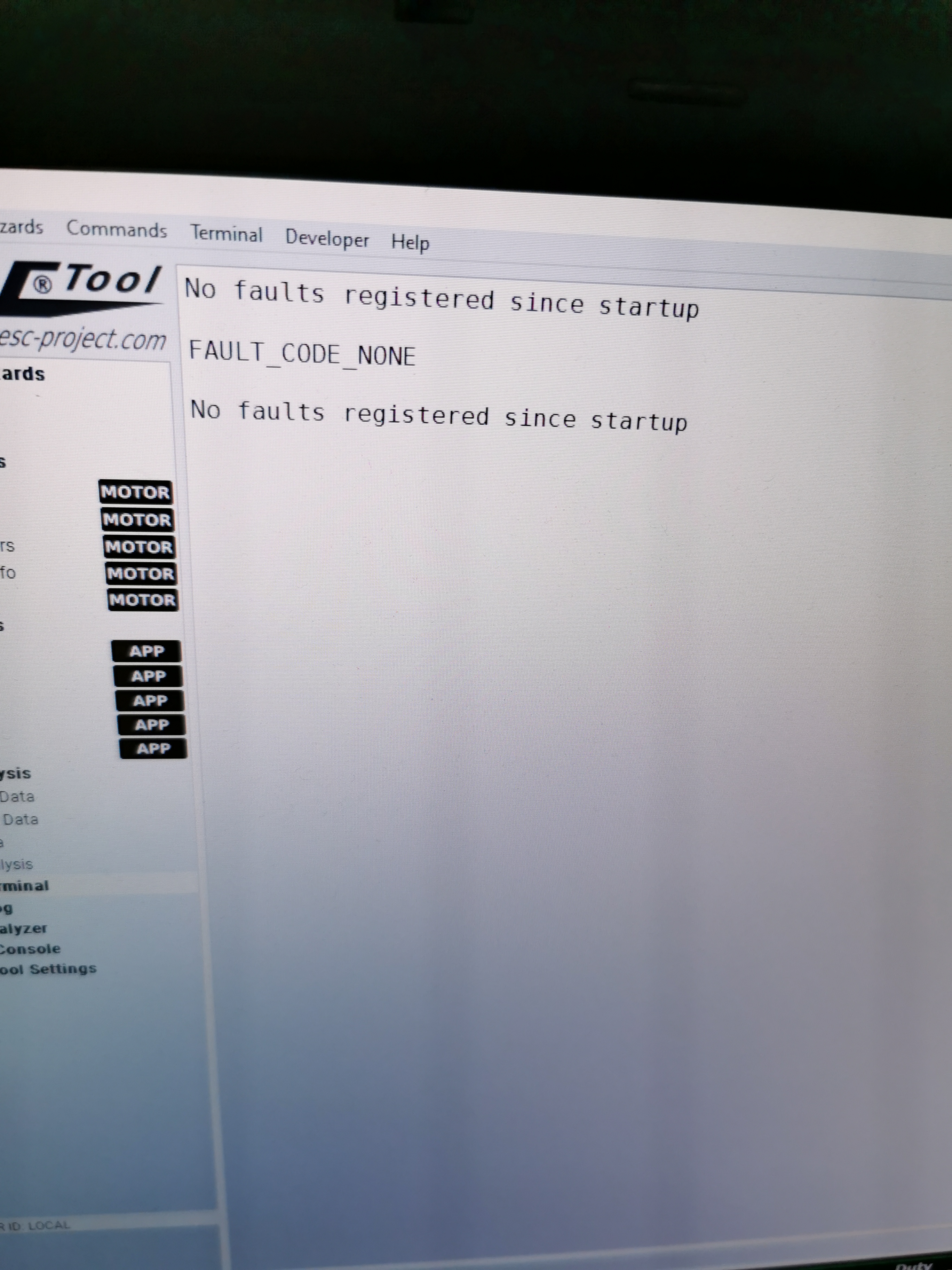 Go in the terminal tab and type “fault”(current fault code). If it’s empty type “faults”(all faults since bootup). By the sound of it something is toast