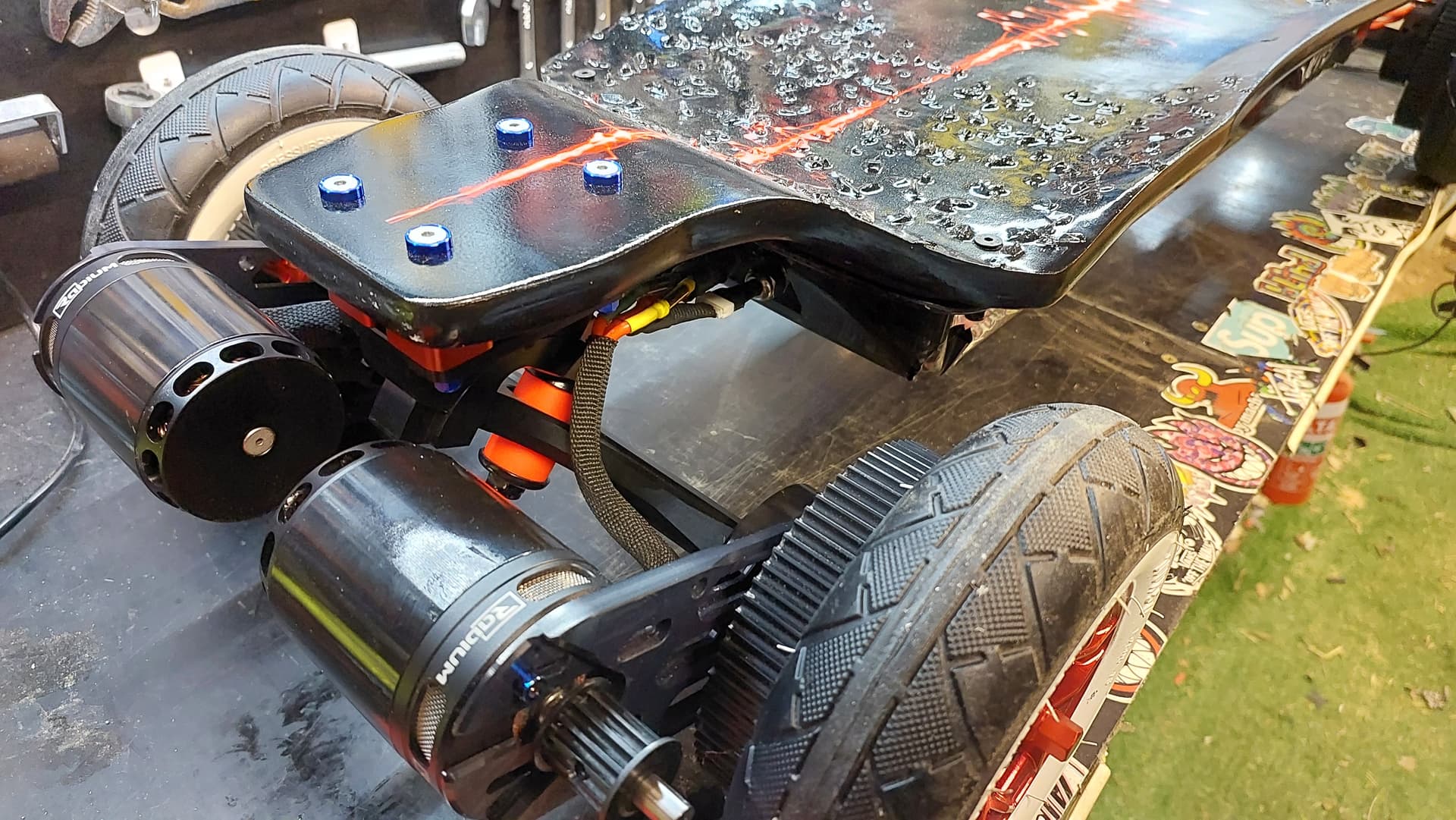 Im really looking forward to pushing on this and tidying up all the motor cables etc, still a few finishing touches to sort out like red anodized bolts for the mounts and other little fiddly bits along those lines. Big props to @glyphiks at FSE for a quick turn around and a top notch job on the skin and frit work on this deck… aiming for an xmas ride which doesn’t give me heaps of time to complete it but I’m hopeful a few late nights will sort it out