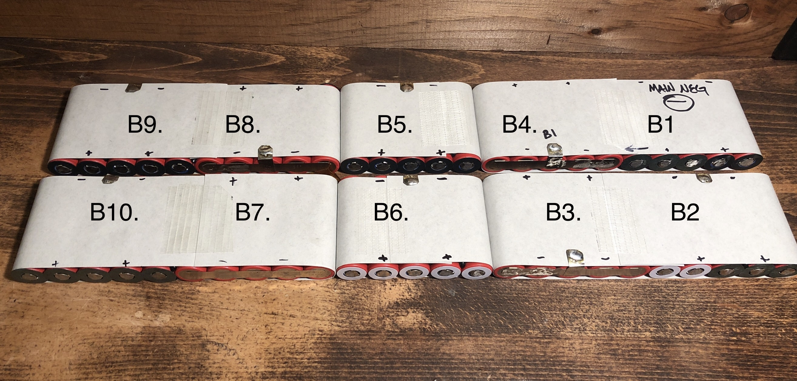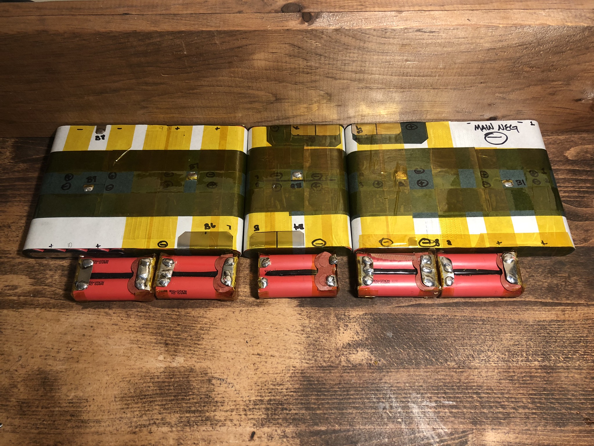 The staggered B11 and B12 groups have x2 14awg connections that are continuous pieces of wire, stripped at the connection site but not cut. Nickel is folded 0.2 x25 for 50mm of connection total width. There were a lot of carefully hand cut shapes to provide the right connections without having them cross over each other. The flex connections in the center are 0.2 x75mm width.