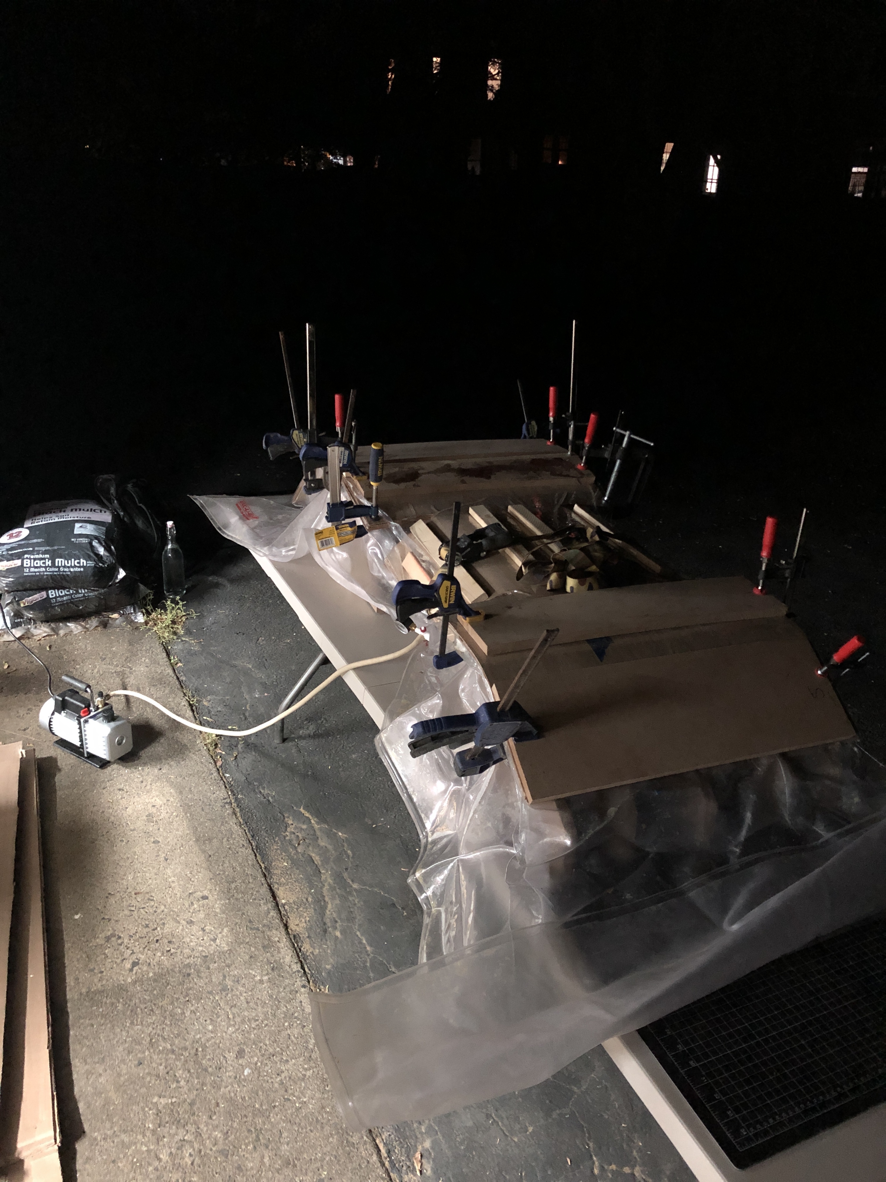 Figure after I sand the top and bottom, I’ll drill small 1/16th” holes into the visible bubbles (there are a few), I’ll then epoxy the deck without any microfiber so that it penetrates the wood. I’ll then mix up more with micro fibers so that it adheres the layers together and then put the layers on, put it all in the bag and give ‘er a suck.