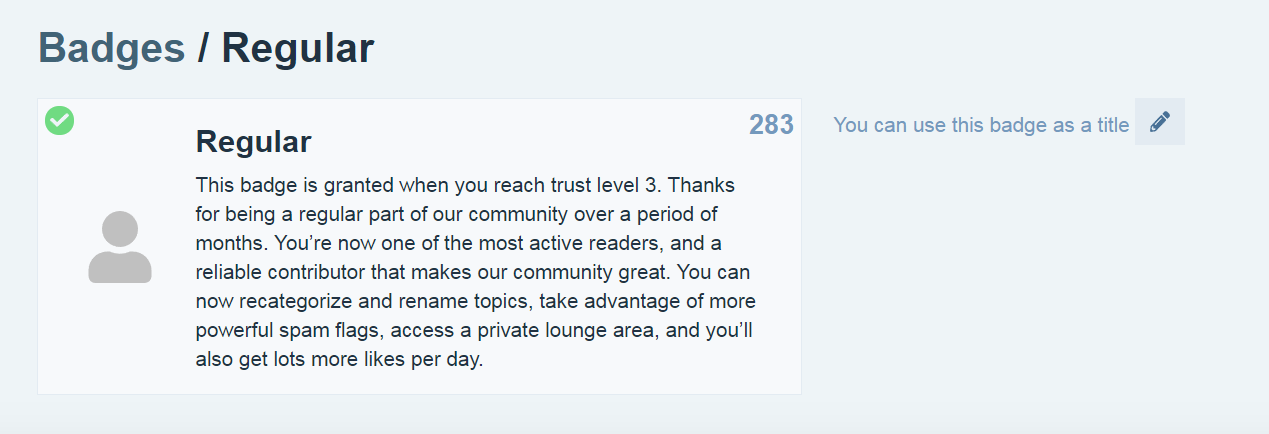 A badge just means you got it once, like an achievement. When you click on my profile, notice it says regular? Your’s says member.