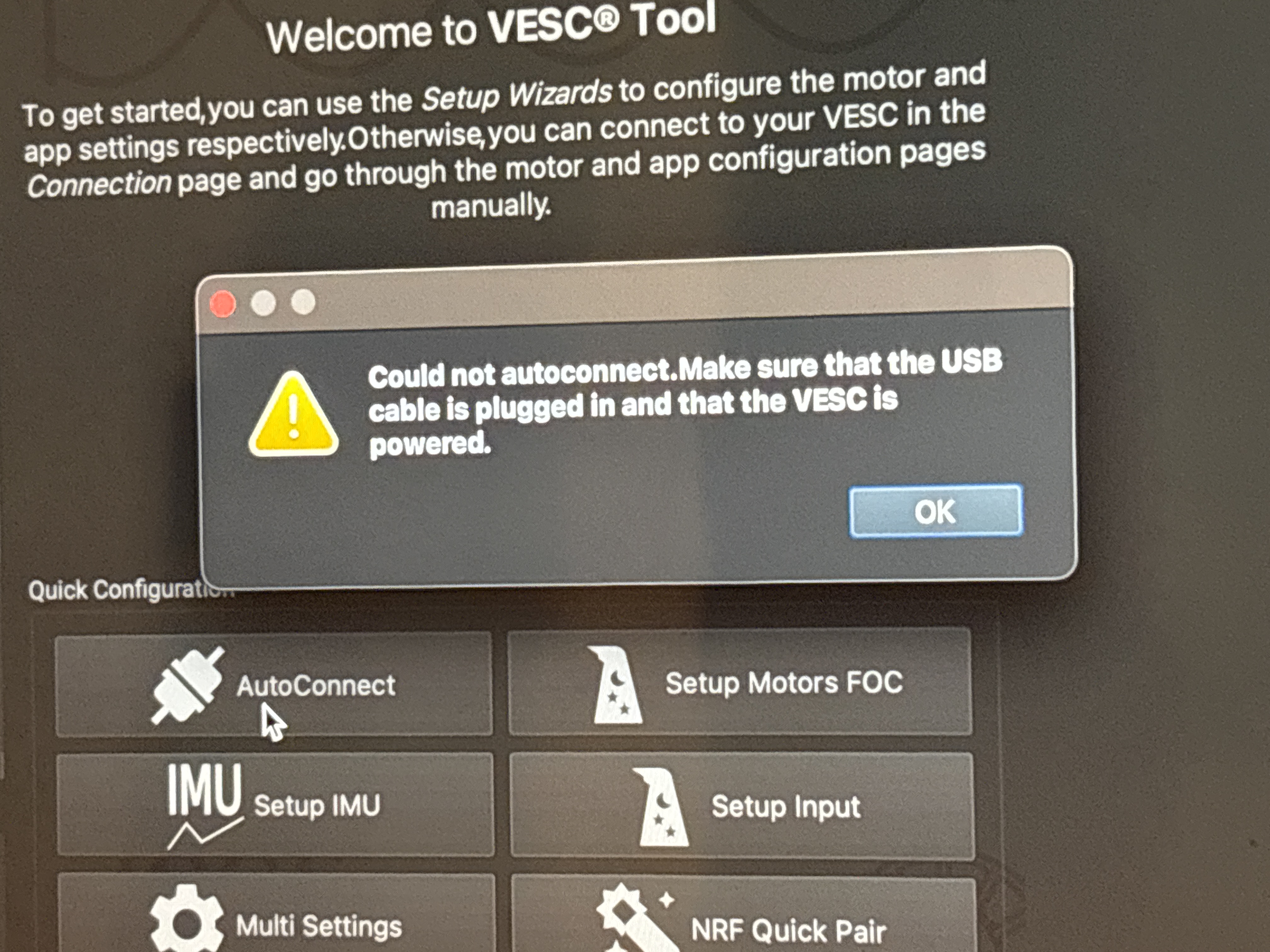 I’ve been trying to connect vesc tool and my d100 but it keeps saying serial port error, could not connect. Make sure the usb cable is plugged in and the vesc is powered. It is all setup, but I really don’t know what I’m doing, any help would be great.