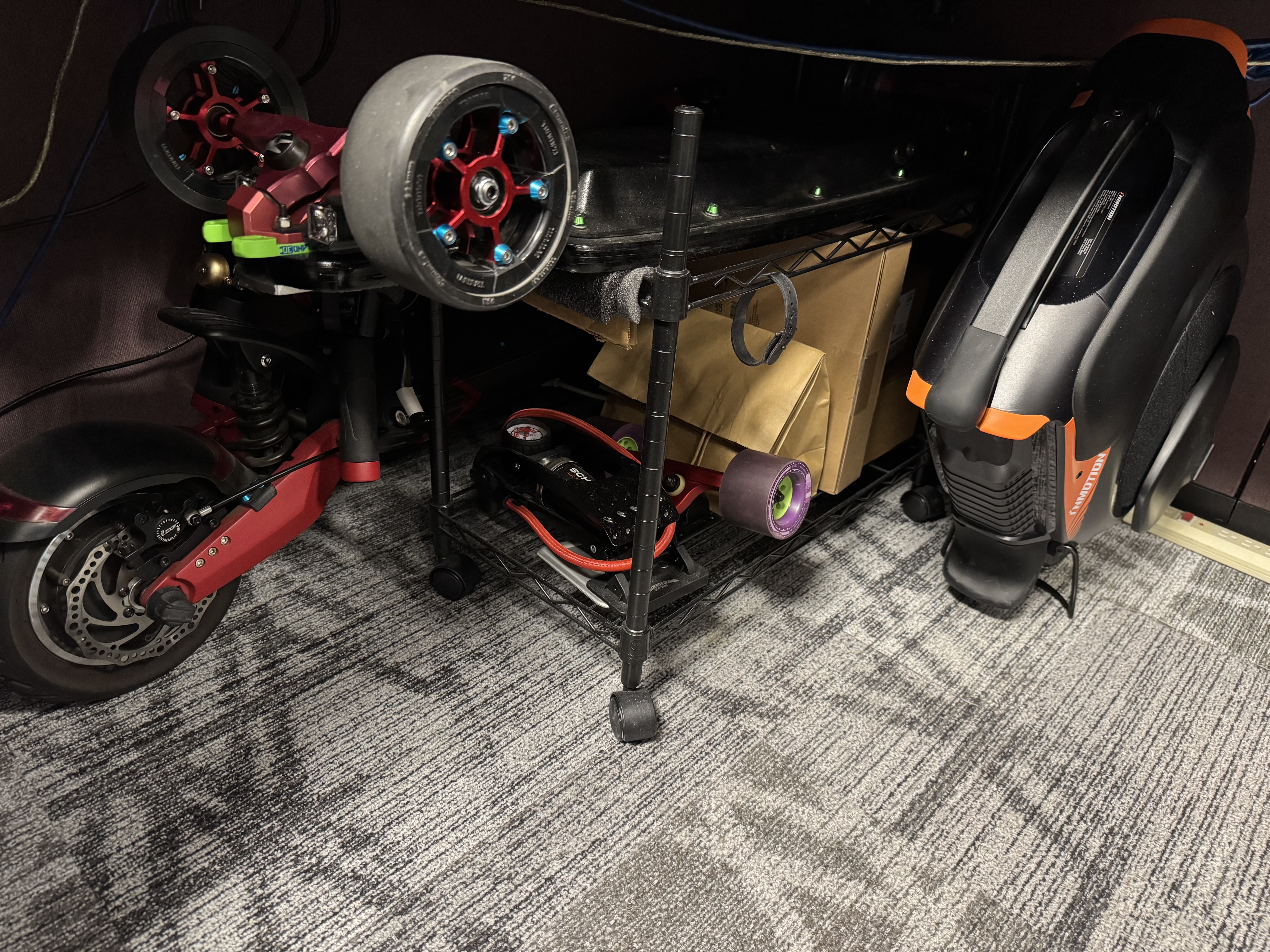 The rides I keep at the office, scooters ain’t that bad. Also got the onewheel in a long file cabinet