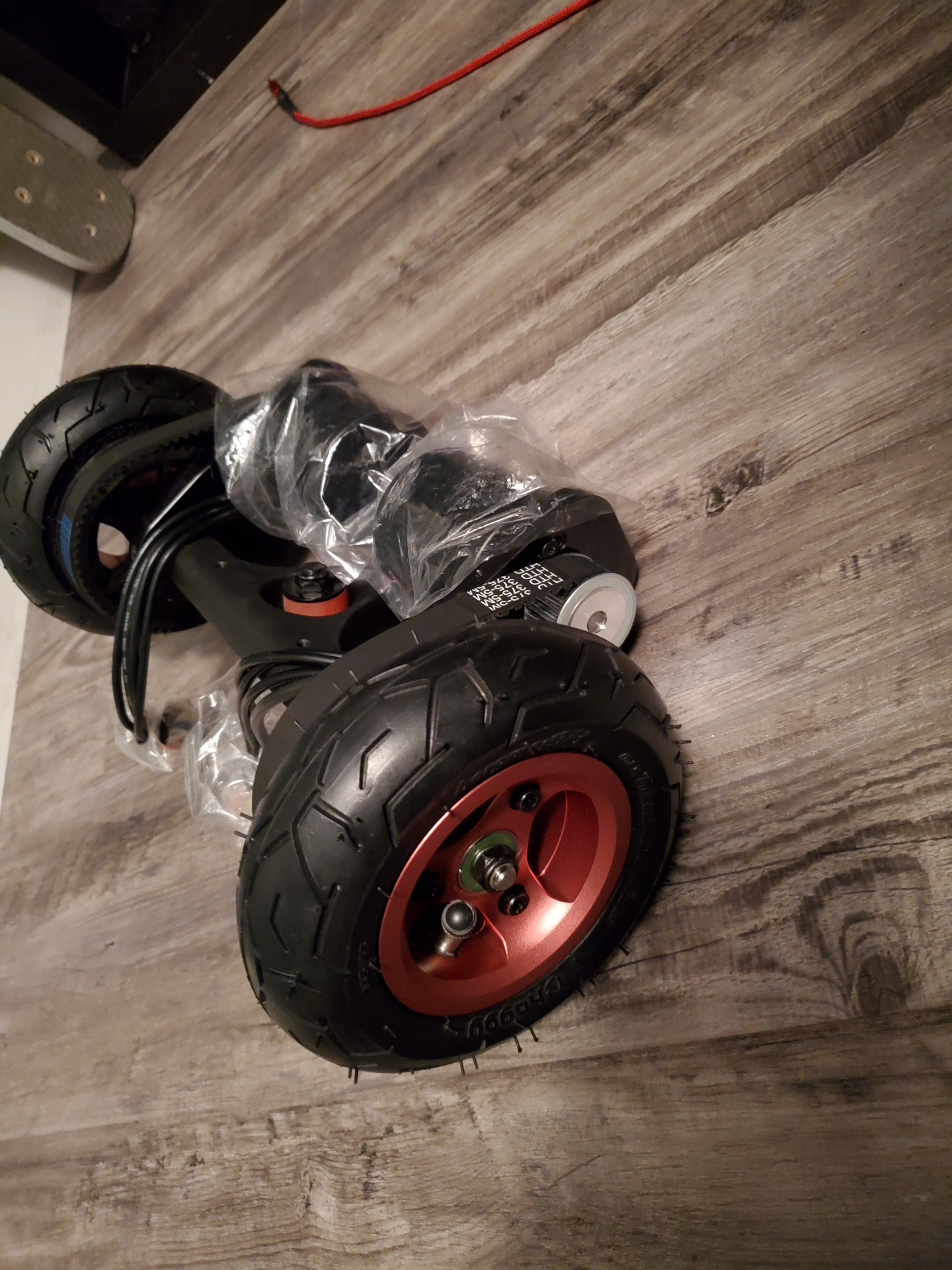 The parts I’m waiting on are the OSRR, 20t motor pulley from Dicky, Battery from Hyperion (Should be any day now🤞) and a new deck which is being stained at Subsonic. I drilled my OG deck to hell so I figured this would be a good opportunity to get the deck all burgandy to match the haggys. Here’s some pics of the parts before I start assembling everything in a week or two