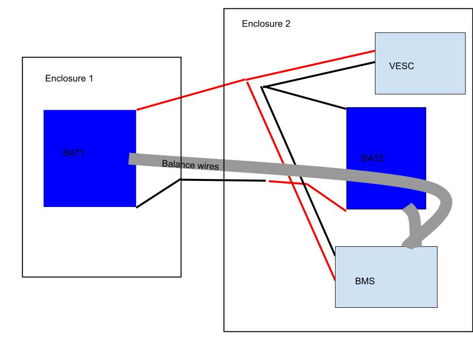 This drawing doesn’t include a power switch or charge port, but it gets the idea across. Depending on which enclosure has the bms, different wires would have to cross the middle of the board.
