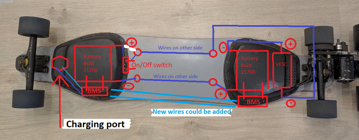 - If you put the BMS in the same enclosure as the vesc, you would only have to run one more cable(6 balance wires) along the top/bottom of your board.