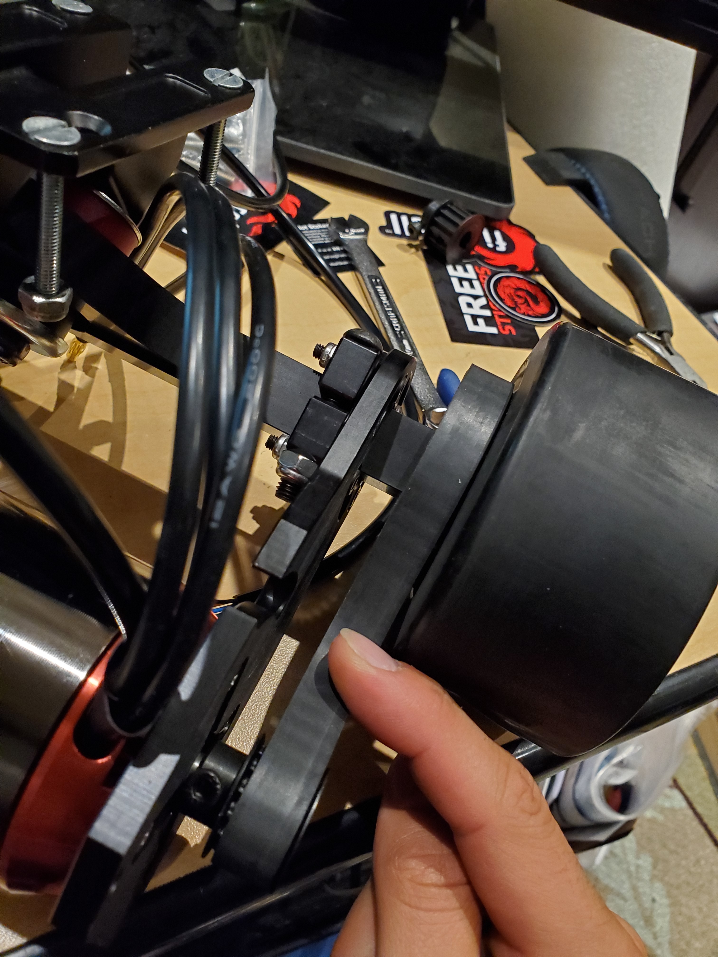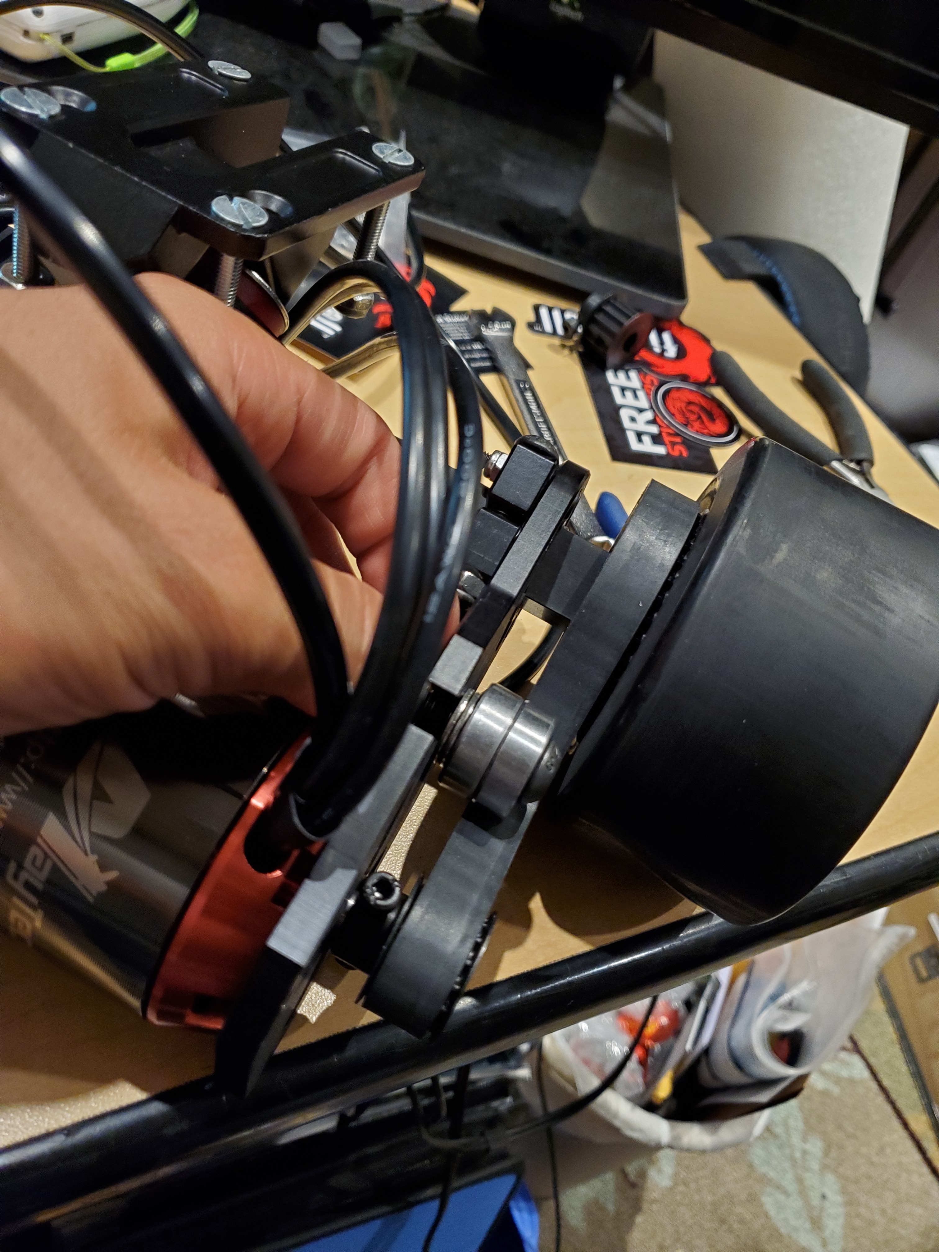 I have 2x boardnamics idler mounts on the precision hangers, 97mm ABEC 11 wheels, and the new Maytech motors from the Fiori group buy. I am trying to set up the mechanics of it and it is not quite working out. I have a 40T wheel pulley and a 14T motor pulley, the belt that I have to use for it is 320mm, which is what was suggested on the website and by several other people, however, I have run into some issues.