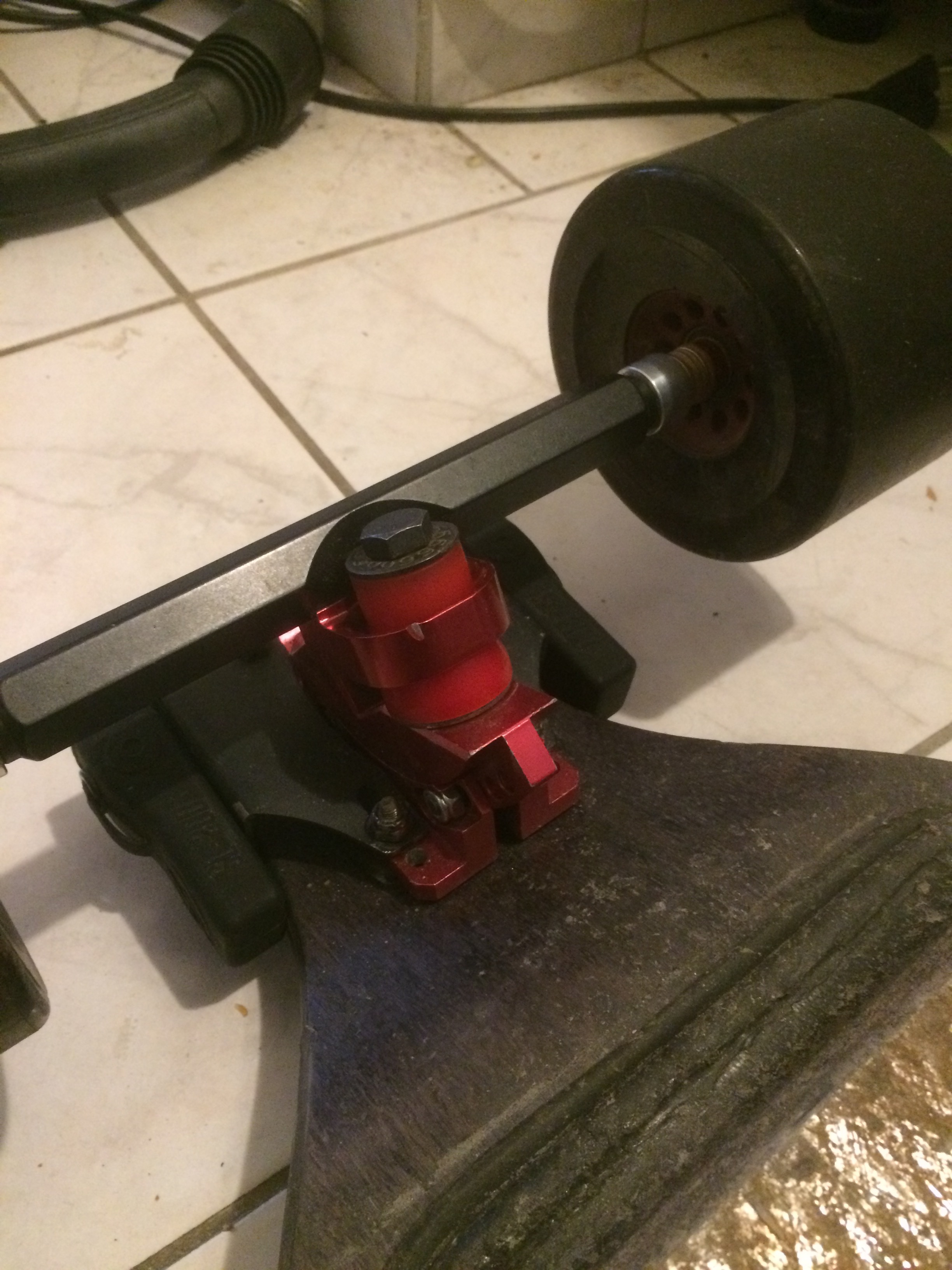Yup⦠You know me dude, Iām king of the weird/unusual setups⦠I started with a 50 degree baseplate, put it on a 15 degree slanted front nosed deck, i needed a riser so I added a wedge⦠the kingpin is almost horizontal, and turns like shit⦠turns off the back foot 35 degree truck⦠but it has a kicktailā¦