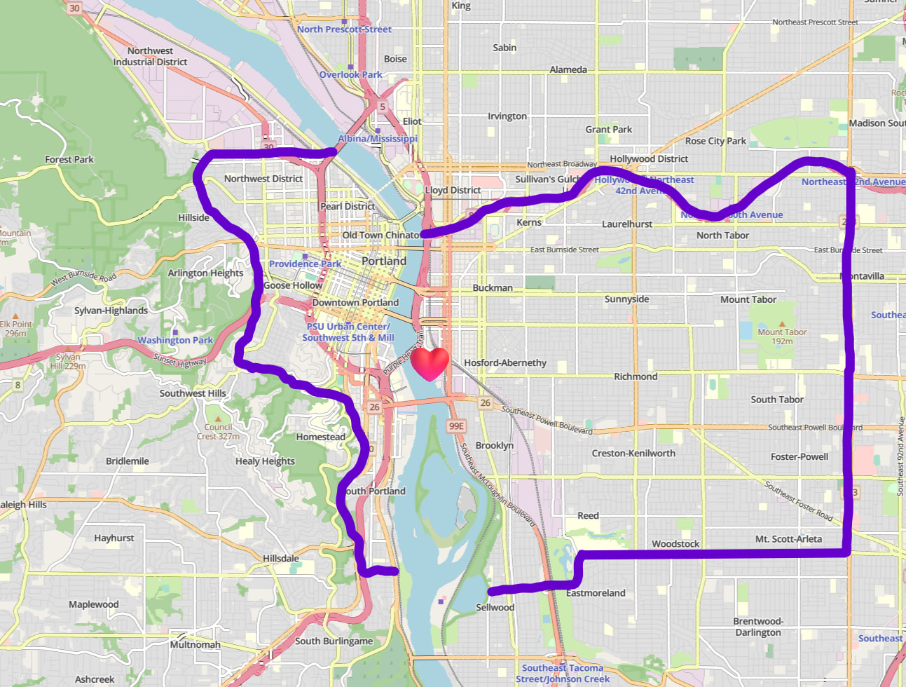 Inside the purple border! The heart emoji is the Oregon Museum of Science and Industry (AKA āOMSIā), which is the meet-up and ending point for most of our rides. I highly recommend picking a location that is close to OMSI, so you donāt spend a bunch of your range getting to/from OMSI before/after each ride!
