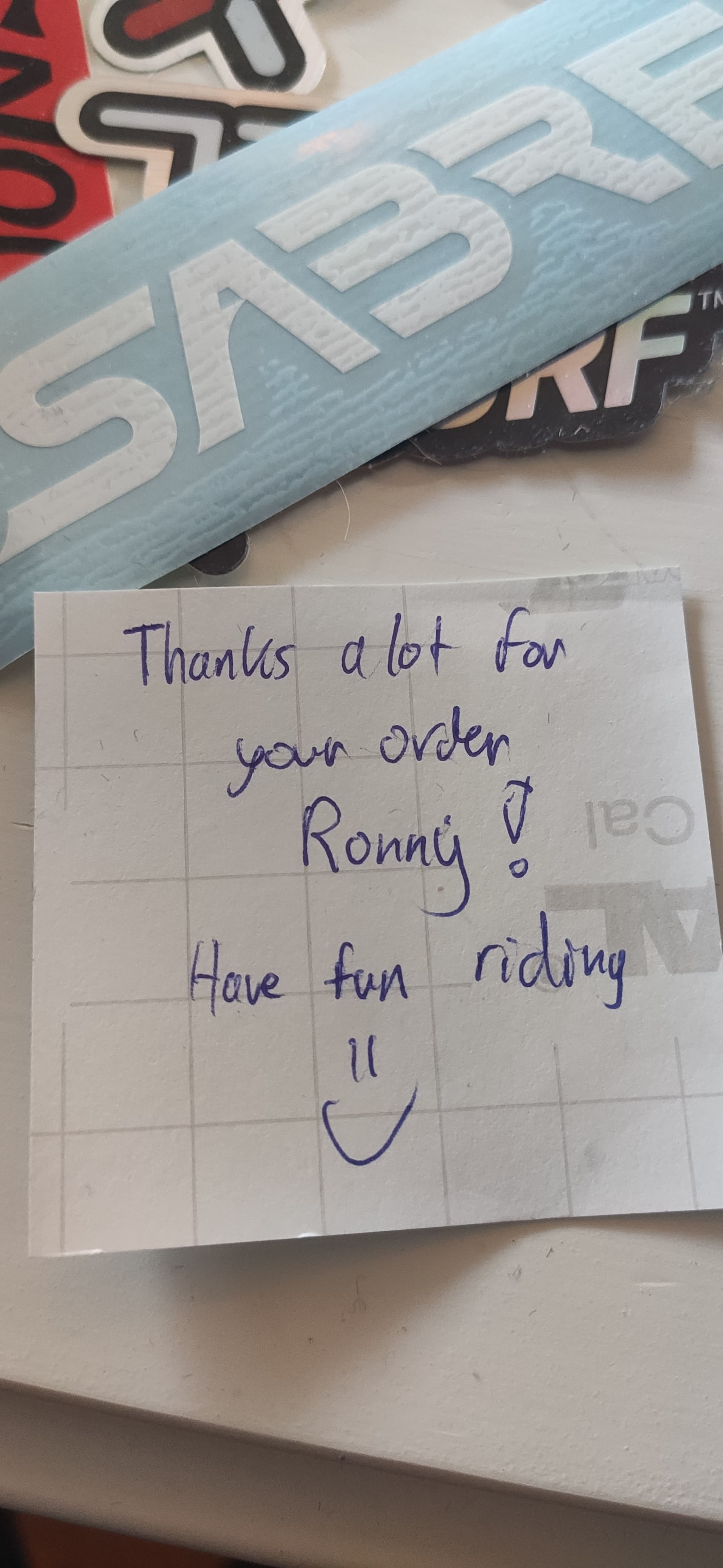 Was looking in the drawer with skate parts. Found this message behind the sticker. Didn’t notice until now. U are awesome @SabreDynamics . Thank you! ![]()