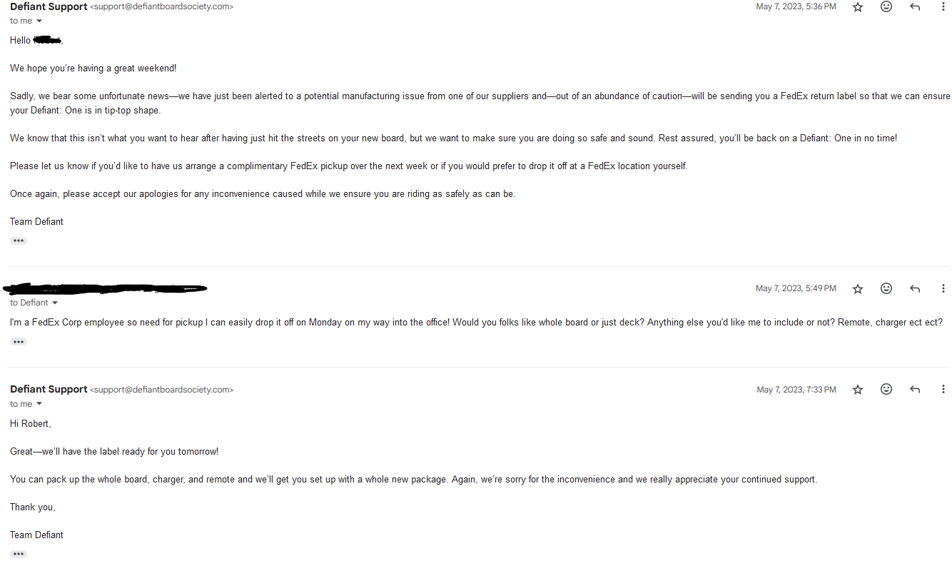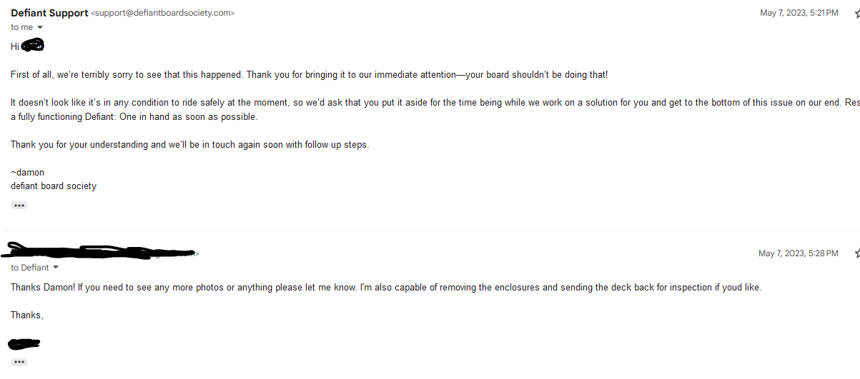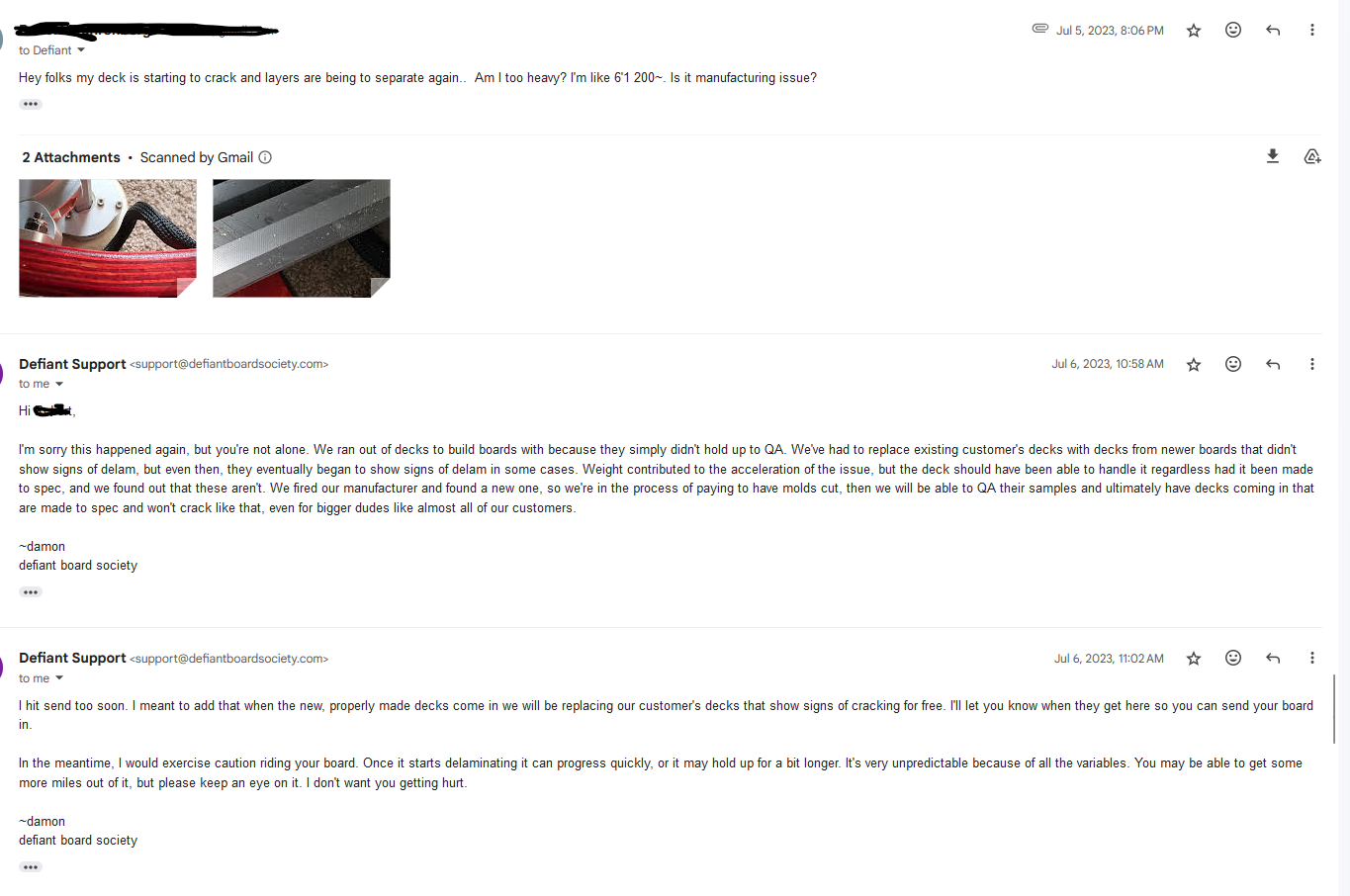 5/7/23. Defiant support emails stating they’ve been informed of Manufacturing defect from one of their suppliers and wants the board returned to them to replace the deck. They would provide a label for me to ship it back.