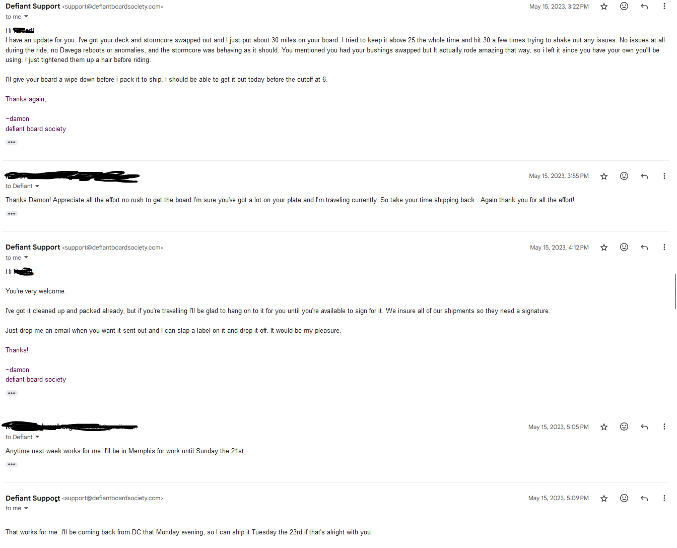 5/7/23. Damon emails back stating based of the photos I sent the board isn’t safe to ride. Set it aside and wait until they have a plan for me.