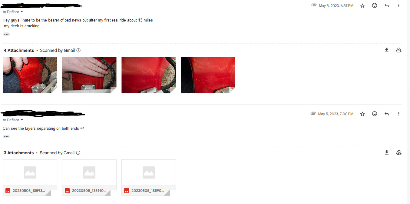 I’m fully aware and fully understand new companies coming into this scene have a HUGE uphill battle to fight to make a functional, cost effective and safe product. Being a lurker on the forms since early 2019 I really wanted to support a company that had someone so close to the scene/forum. I was willing to take the risks of the growing pains involved here. Not only to show my support for this small community but to pay back to the people involved in helping me in this hobby. We can call that naive, but it felt right to me. Now it’s just gone on too long at this point. Between the constant back and forth with dates moving on when the decks would be ready, lack of updates and constant marketing spam and price drops while I don’t have a product I can even ride… Really really just sucks. In all reality I’ve given Defiant a 3,000$ loan to QA check a board for them. With how quick these decks broke both times it should have been very clear early on there was something very wrong before these were sold. I truly do not believe ANY production board was fully tested and vetted.