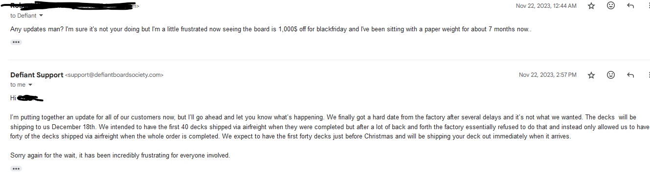 11/22/23 November is basically over with no news so I reach out asking for any updates. At this point i’m pretty much done and kinda pissed off. @longhairedboy responds stating he’s working on an update for customers. The decks would be shipped to Defiant on December 18th.