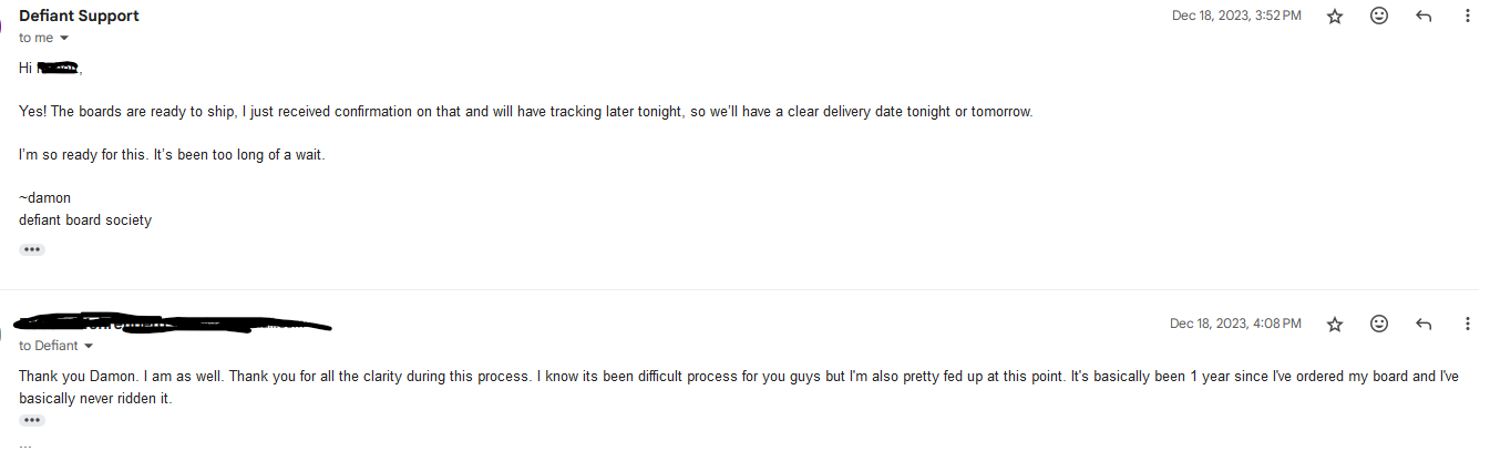 Unknown dates Possibly end of January?.. Lost these emails. After some back-and-forth emails with someone at Defiant they finally told me my board would be shipping in April.