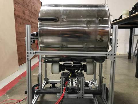 The machine has an electric skateboard drive train and has springs to simulate a rider of 500lbs (getting the test rig to rotate that at high speed is another story… Hint: doesn’t really roll that well at high speeds).