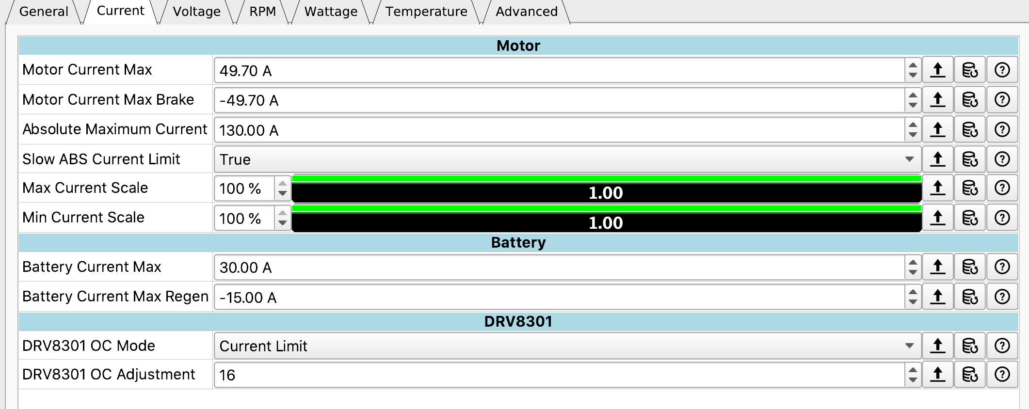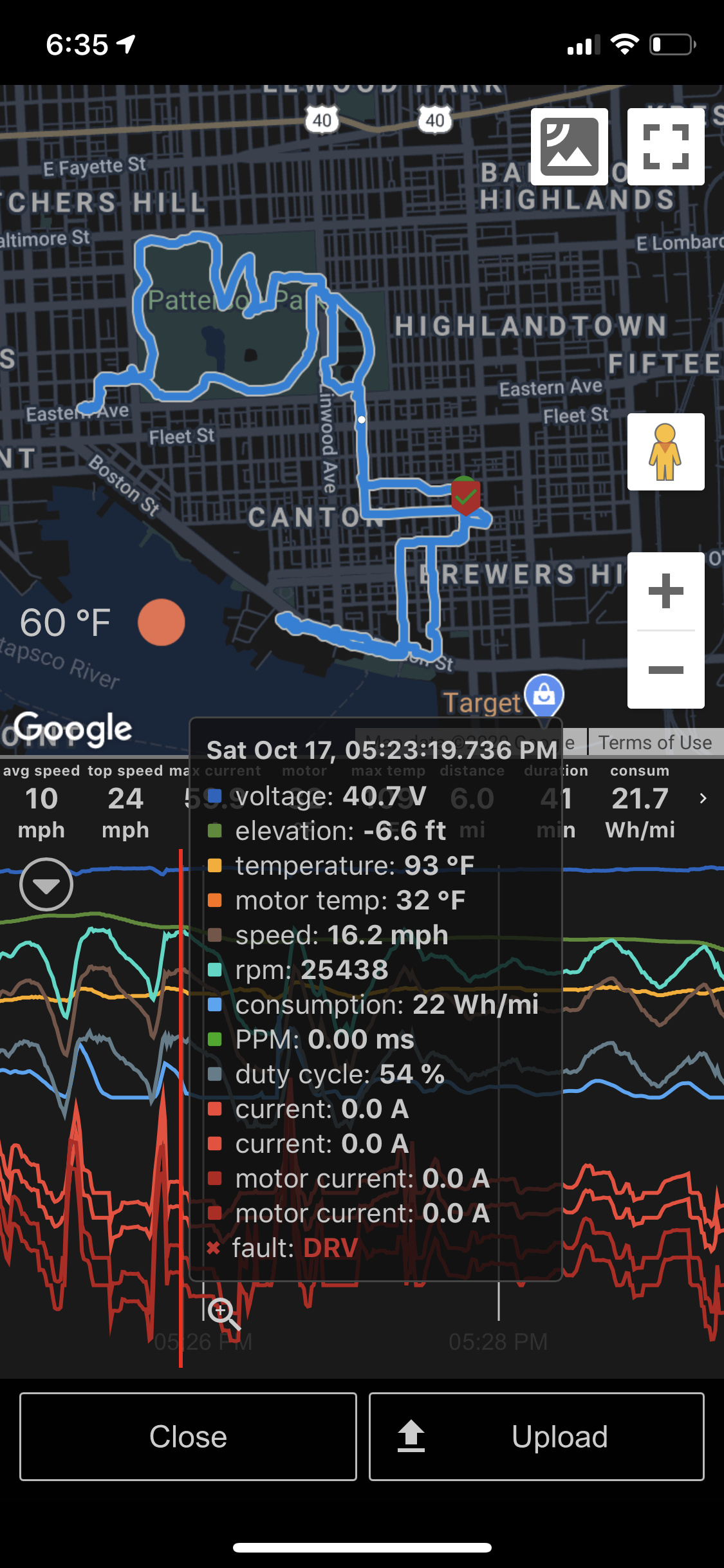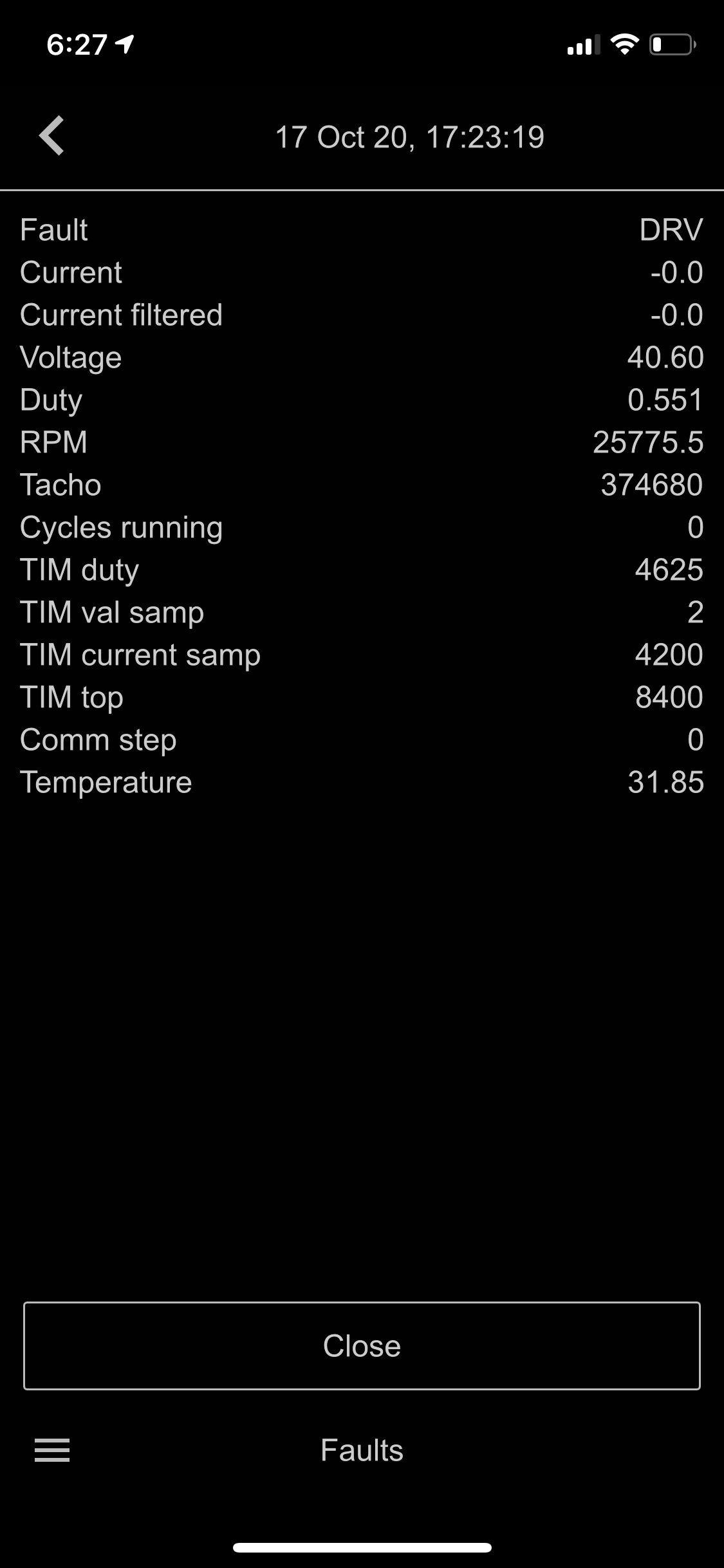 I’m seeing a single random DRV fault about 50% of my rides. It seems to be within the first mile or two on a fully charged battery and the fault only shows for < 1s in Metr Pro tracking. I never experience any cut outs (it’s super short, so who knows) and it seems to only happen while mostly coasting (barely or no current being applied). The fault always shows -0.0 for the current, RPMs will be whatever I’m coasting at, and not sure what some of the other numbers mean…