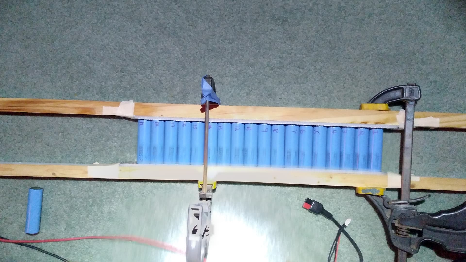 You can make it easier by using copper strips and magnets instead of trying to connect each cell individually. Line up two long copper strips one for the positives and one for the negatives. Place your cells in a row with all positives touching one strip and all negatives touching the other. Then use neodymium magnets on top of each cell to press the strip down firmly and make contact.