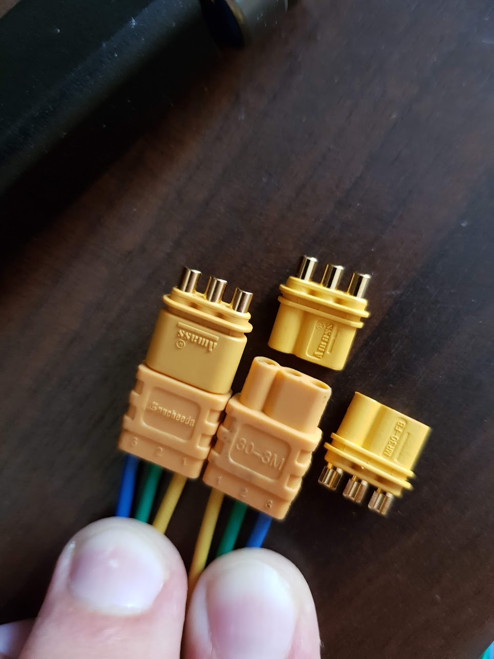 Yeah, those connectors look funny. I thought these would be MR60, not MR30. I didn’t have any MR30 on hand but I did have MT30, which are a pretty good fit with for the tiny phase wires and still big enough for using 12AWG at the VESC side.