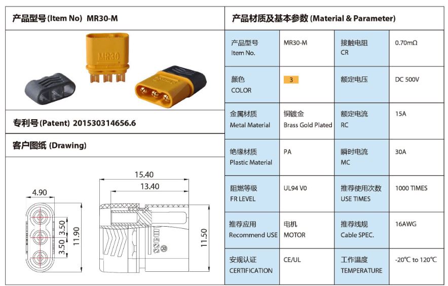 I guess they are not the genuine mr30 connectors, but they fit the same. So maybe the ratings on these knock-offs are even worse, who knows. 15A per motor might be enough for some (with 30A bursts), especially if you want to max your range. Maybe I try them.