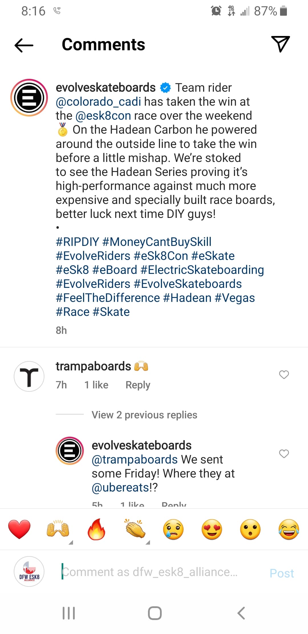 I feel they’re IG post selling their Hadean in the race was uncalled for and an unsportsmanlike hashtags towards diy builder. They talked about how the Hadeans power won against a more expensive and powerful diy. Just not cool. For one, the track wss slick as shit and so no one can really truly let loose on their power. Hell even the stooge boards couldn’t whip it out since the track was like ICE!