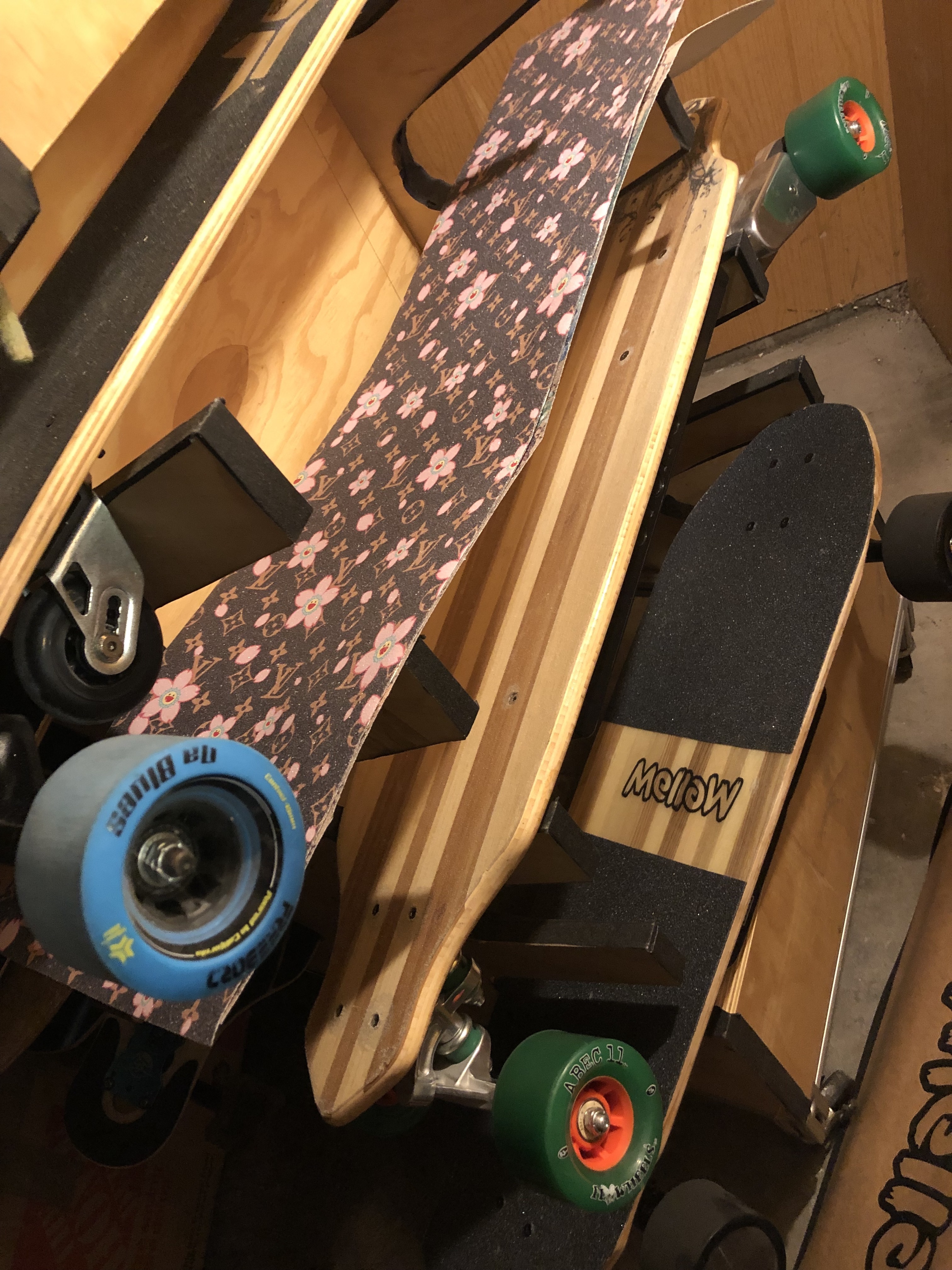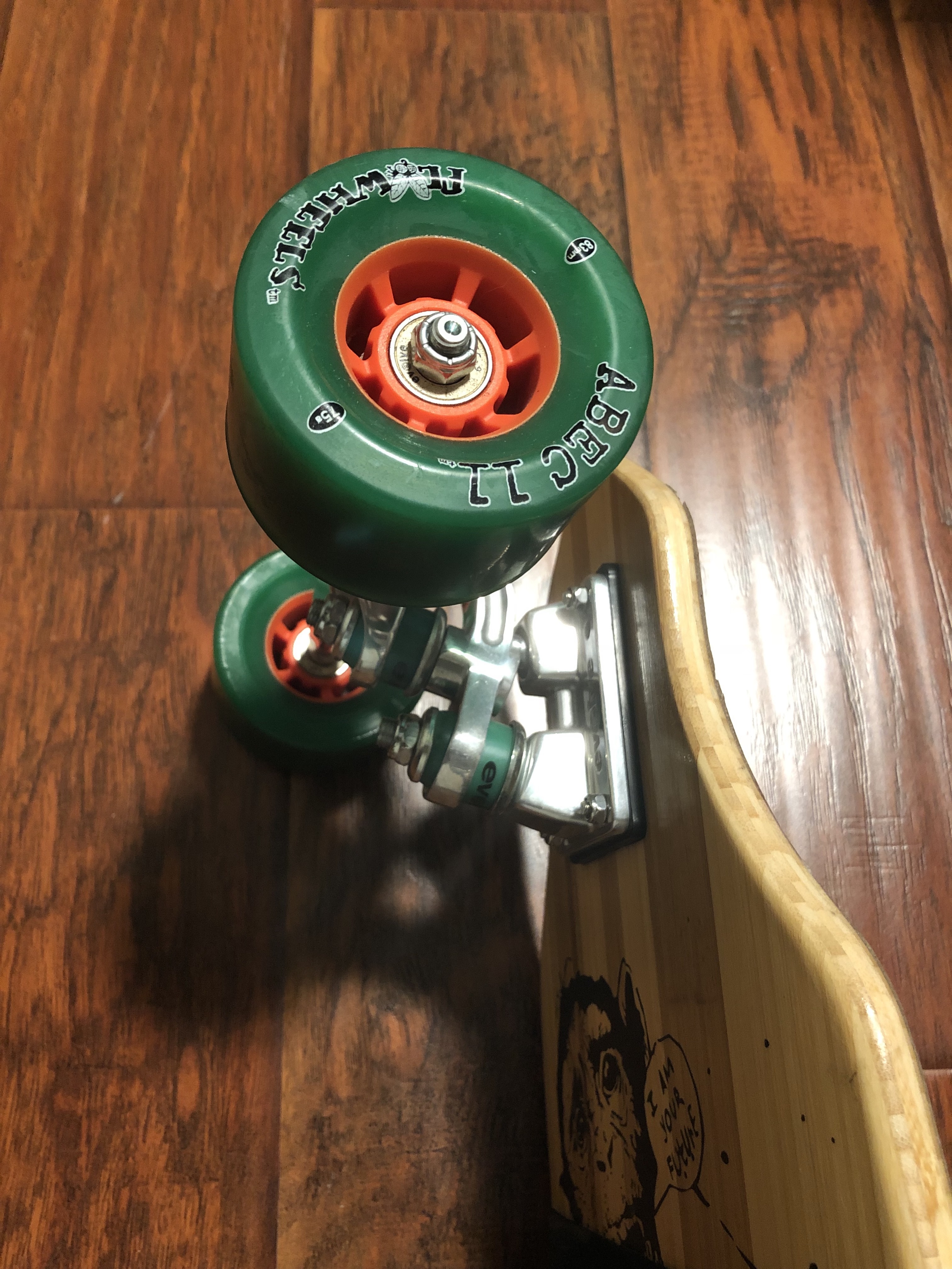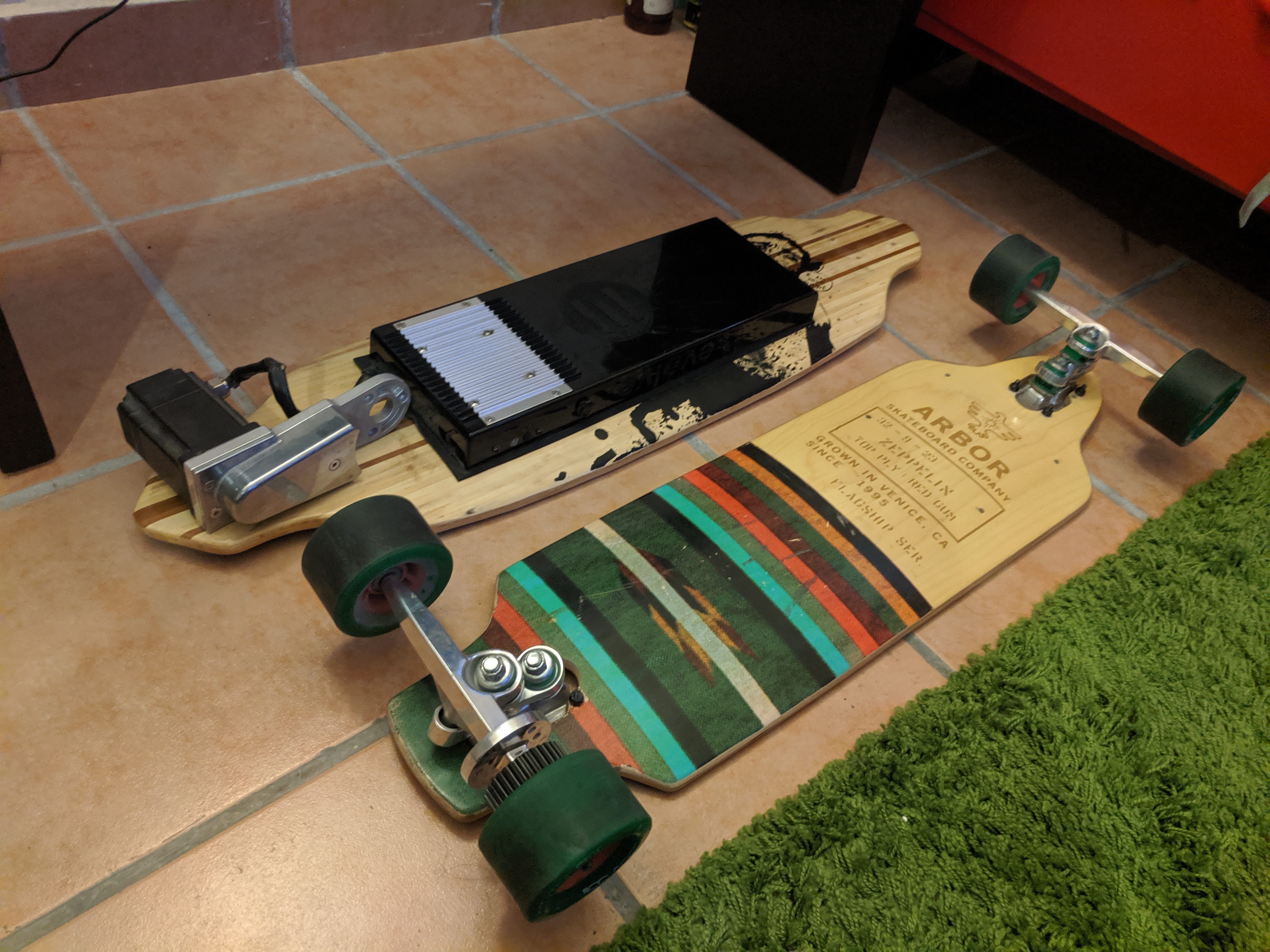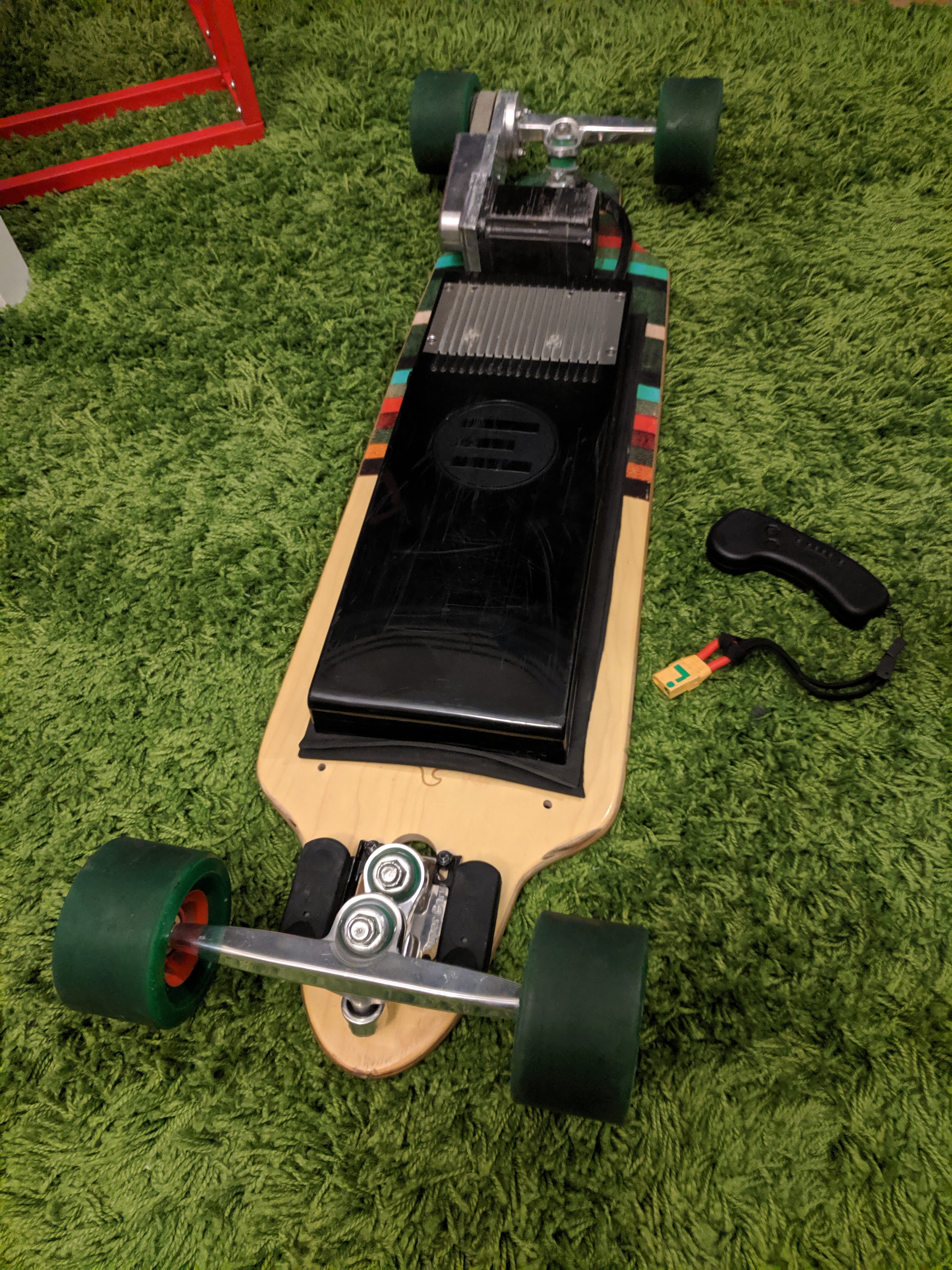 update, still deciding on parts to get. placed the trucks on the deck and checking if the current enclosure will fit on the setup. definitely need to have the trucks reverse mounted for clearance.