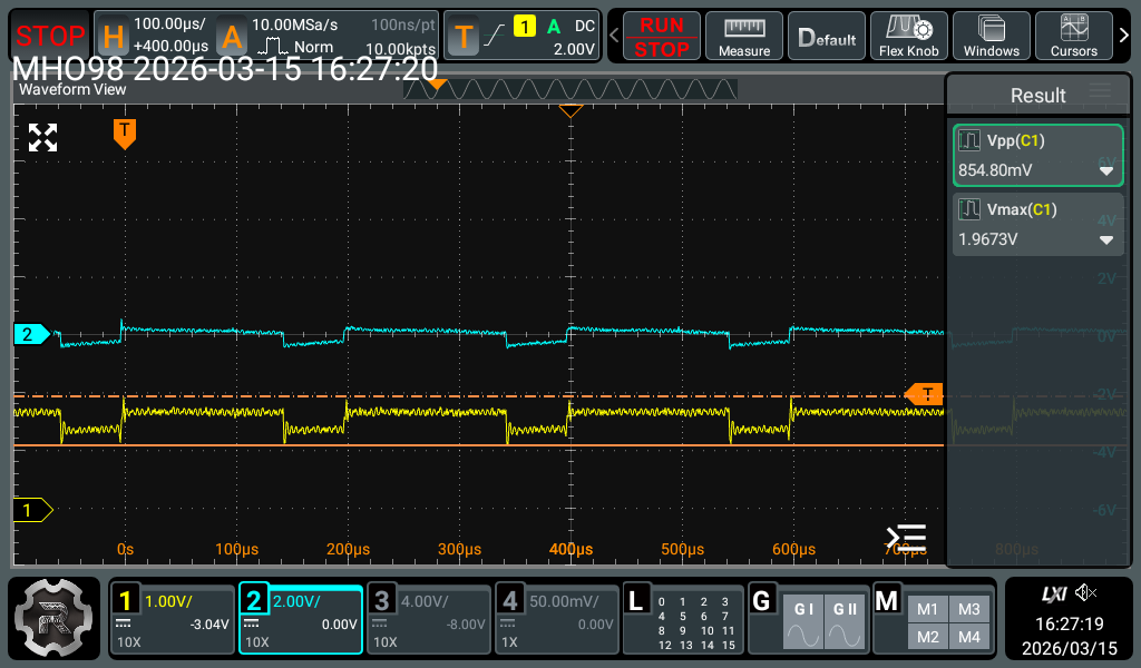 I already found that some apparent power noise on my oscilloscope was caused by the probe ground lead. Using a spring ground reduced that significantly, but the motor still does not rotate correctly and the same fault remains.