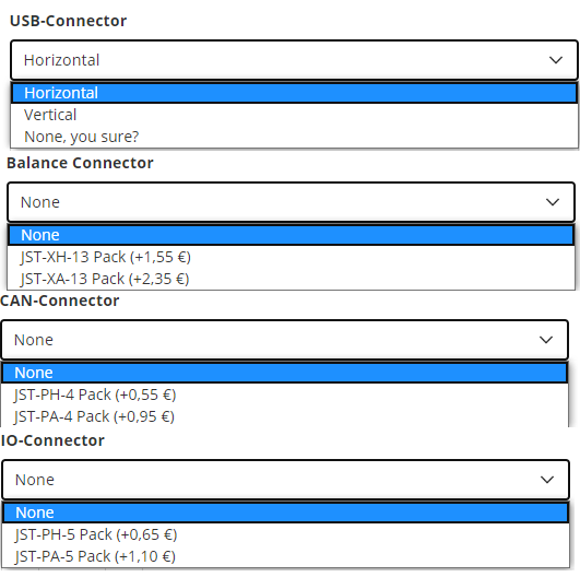 I felt the same when I first saw all the options. It’s nice to have flexibility but too many options easily get overwhelming. Personally, I would only leave the horizontal/vertical selection for the USB port. For everything else, I would stick with JST-PH and JST-XH since those are more common and I would include both vertical and horizontal connectors in the package. They cost nothing and soldering them is super easy. If the customer can solder the wires on the C and B pads, they will be able to solder the THT connectors as well. Plus, this would allow for people to make last minute decisions about the orientation. Sometimes you don’t know how exactly things are going to fit in the enclosure so deferring the decision until you’ve had a chance to play with various layouts would be beneficial. Just my 2c.