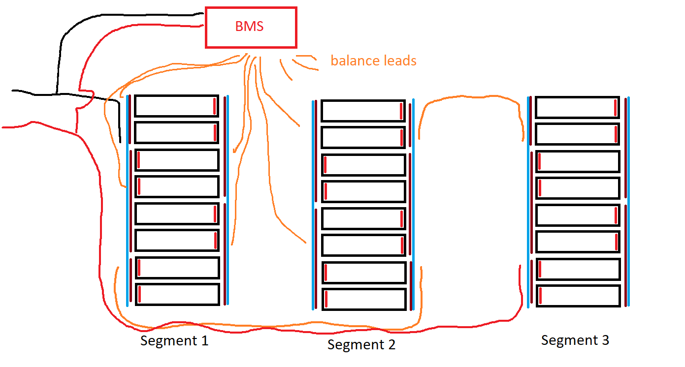 How I would make a segmented pack wiring wise 3x 4S2P segments to form 12S2P. So you would have your rigid segments distributed in your mechanic and then you run a main discharge cable between the segments to chain them together and also connect a balance lead to everywhere where you need to and run that to the BMS for cell sensing.