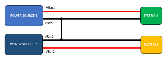 The positive terminals (+VBat1 and +VBat2) on the two systems are never combined and are completely separated. Only the ground is common to both, so if you draw this circuit, +VBAT can’t be connected. What do you think?