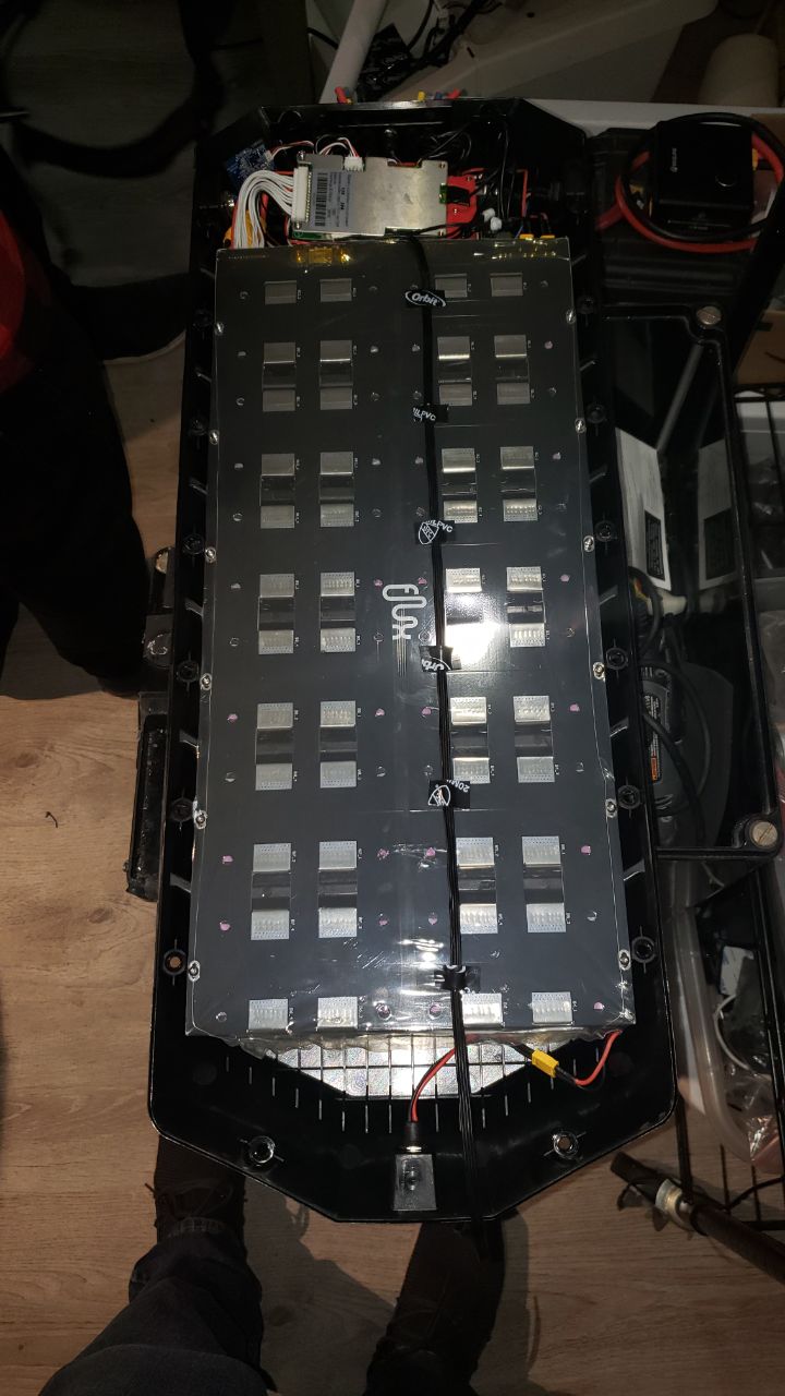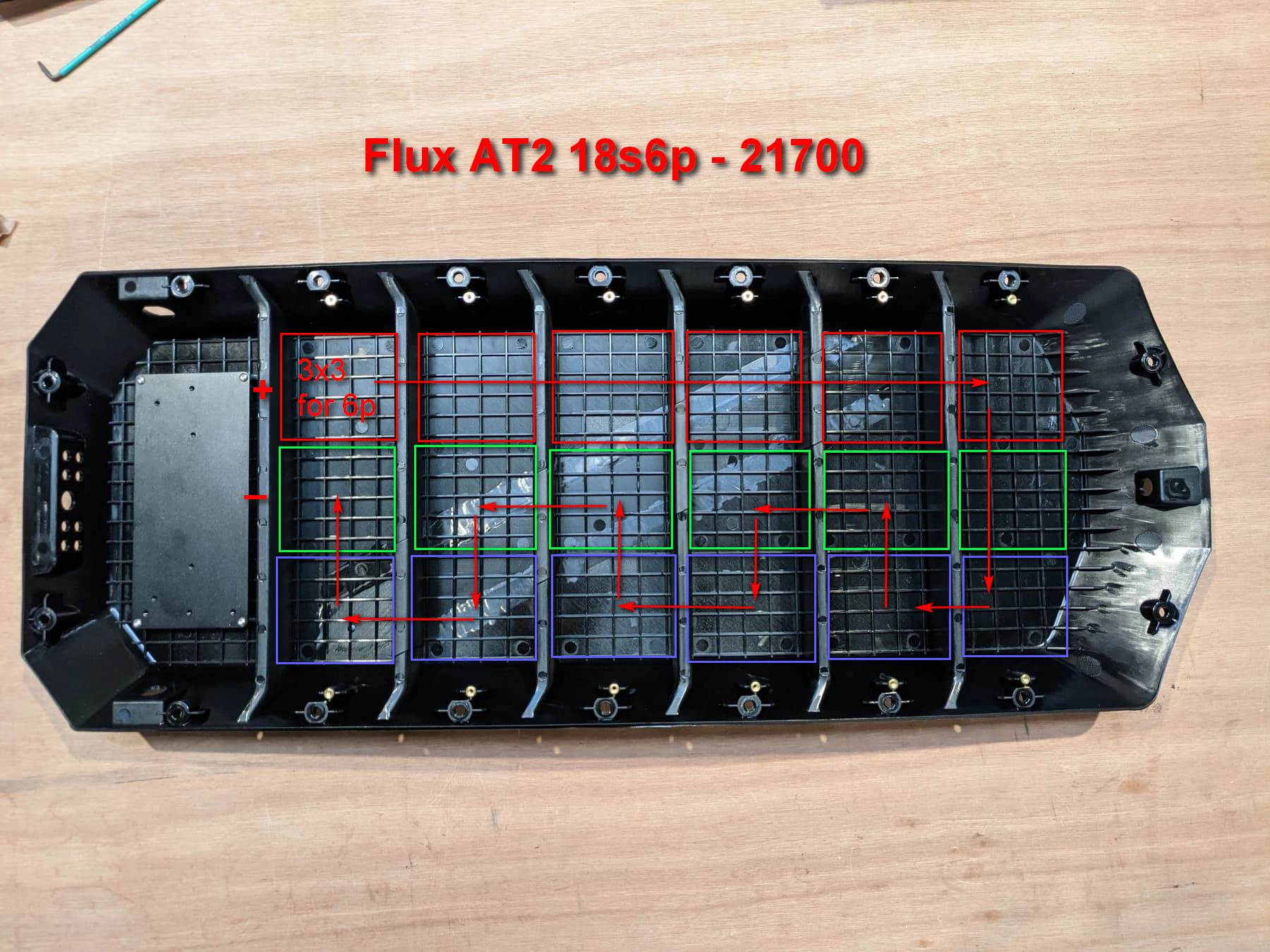 New enclosure is injection molded and can hold 18x 21700 cells in each of the 6 compartments for a 12s9p configuration or possibly a 18s6p if 6 sets of 18s1p batteries were made and paralleled. Extra room in the front for a small BMS like Flexi