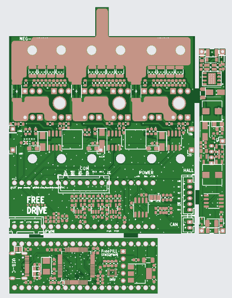 Yes, the spacer is 3 mm, and then I made the pinholes 1.4 mm - same as the thickness of the widest part of the pins. So the spacing between the boards will be kept by the plastic spacers, at 3 mm. Don’t know if it’s a good idea, but it’s the only way I see a solution where the “pill” can be attached to the foc-board through a push on/pull off connector, and still not exceed the “height” of the mosfets, which is 5mm.