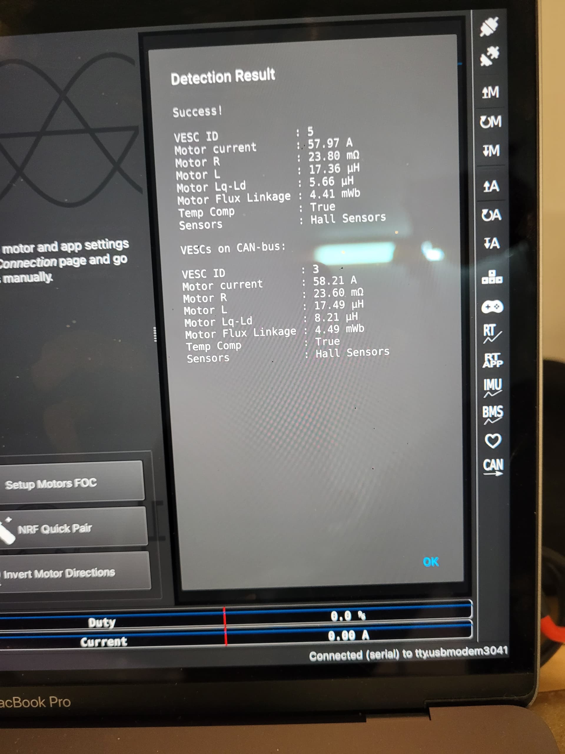 Motor detection from the other USB port and running detection for both motors via CAN results in success.