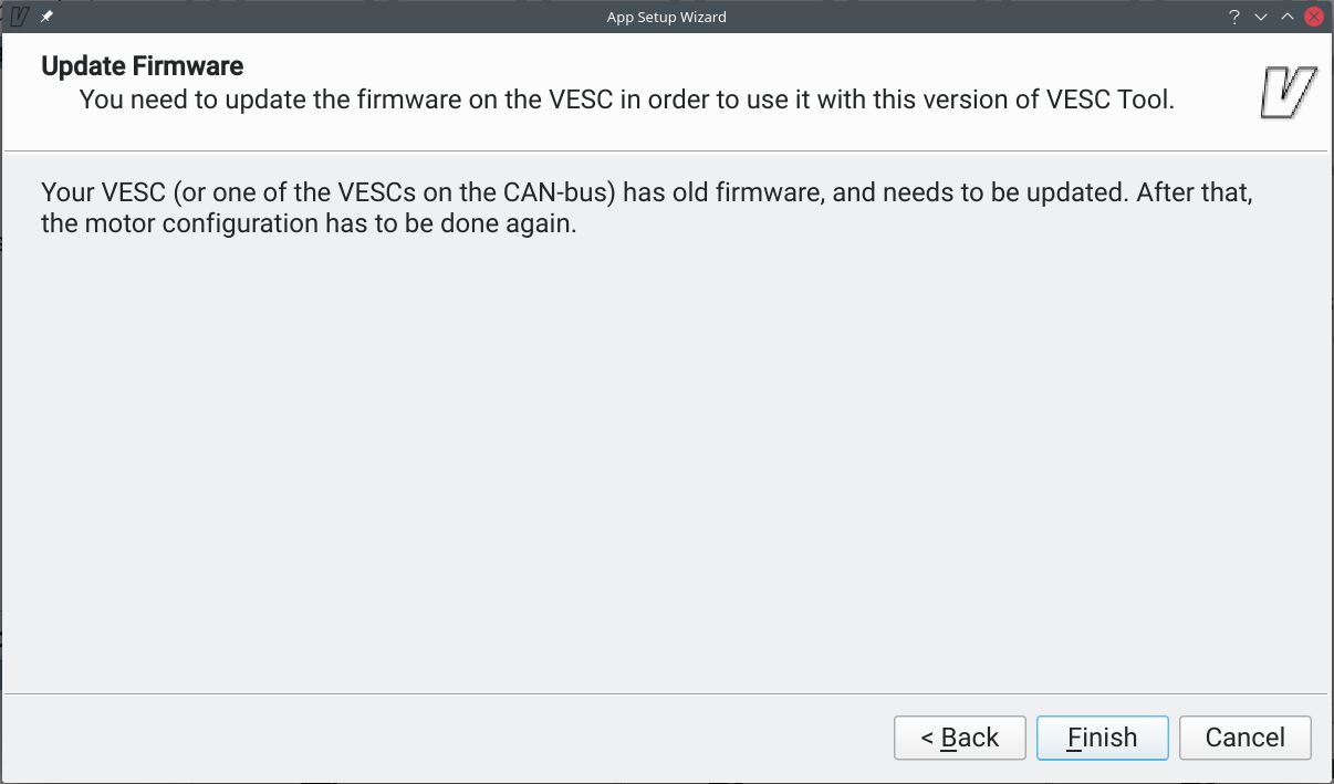 Also I did save my original configuration by going to the menu āConfBackupā and saving it and then restoring it after updating the firmware, which seem to be version 5.01 (already install), but I think the VESC tool is looking for version 5.02