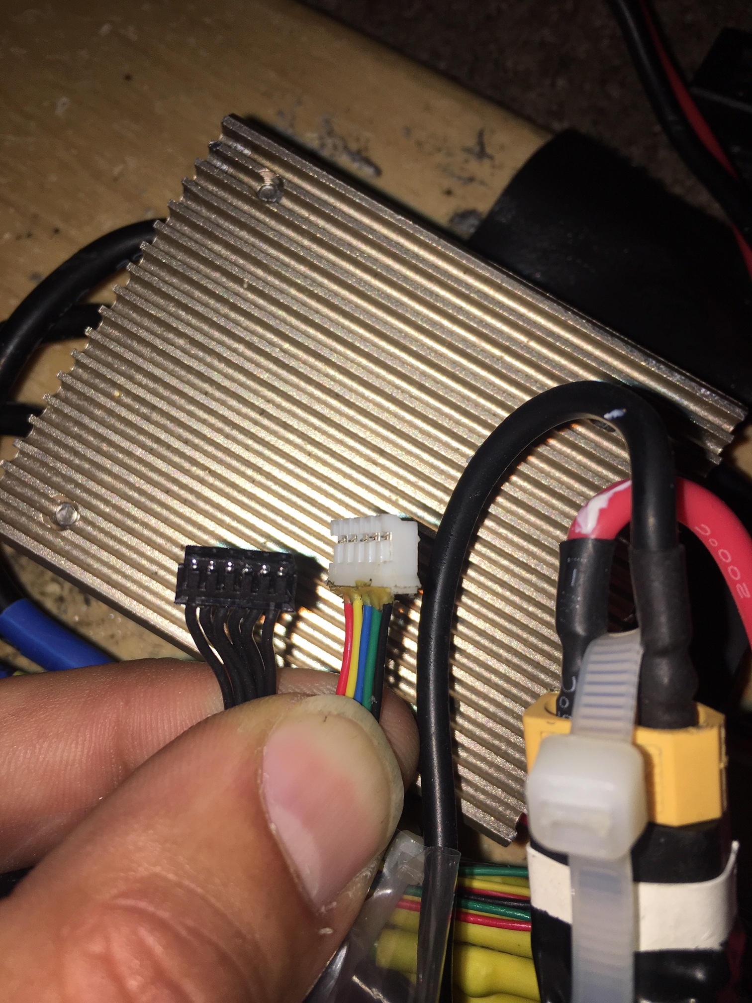 The problem, as you can see, is that the 6pinJST I want to solder on is not color coded and I have no idea which phases would go where. From what I’ve read I would just not solder the temp wire (the extra wire out of the 6/5) but I have no idea which wire is temp here. They are all black…What do I do??