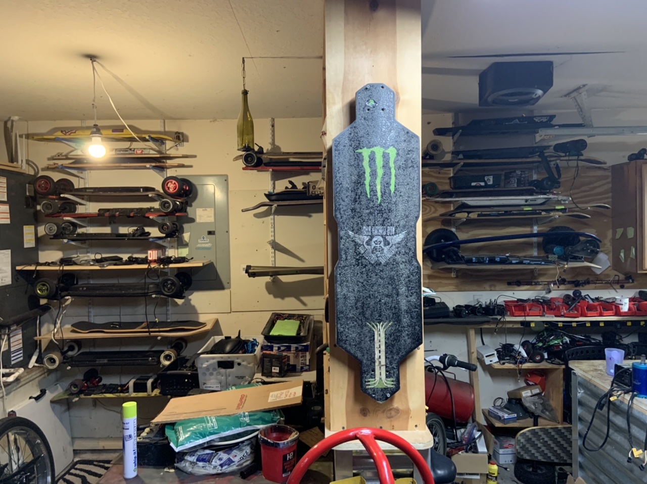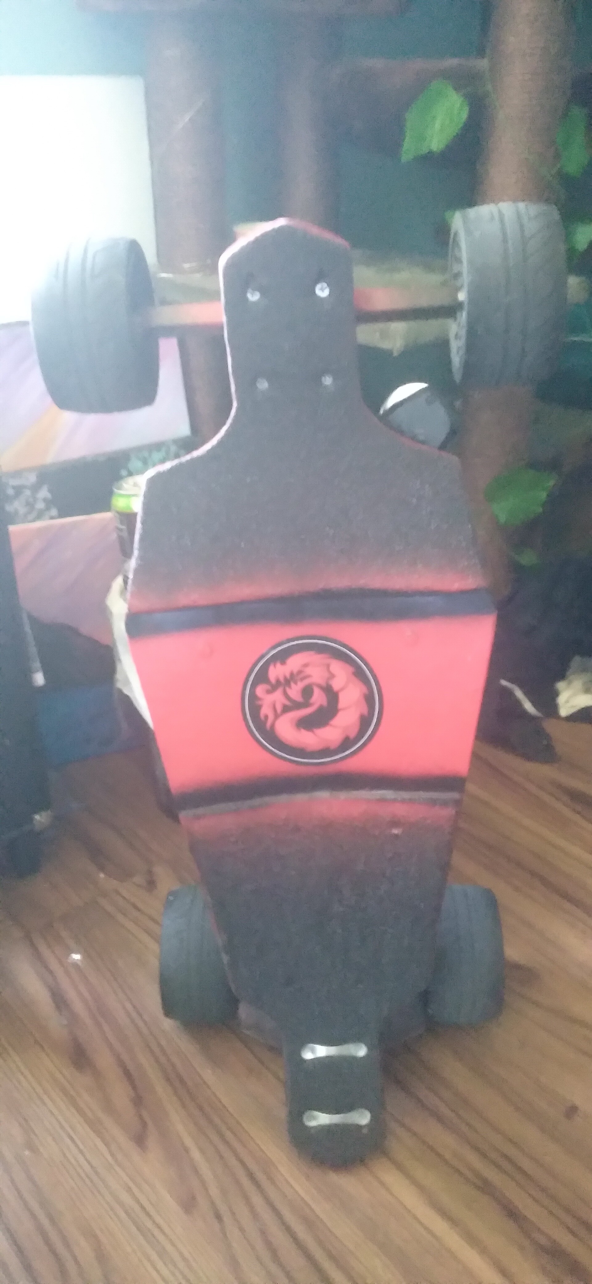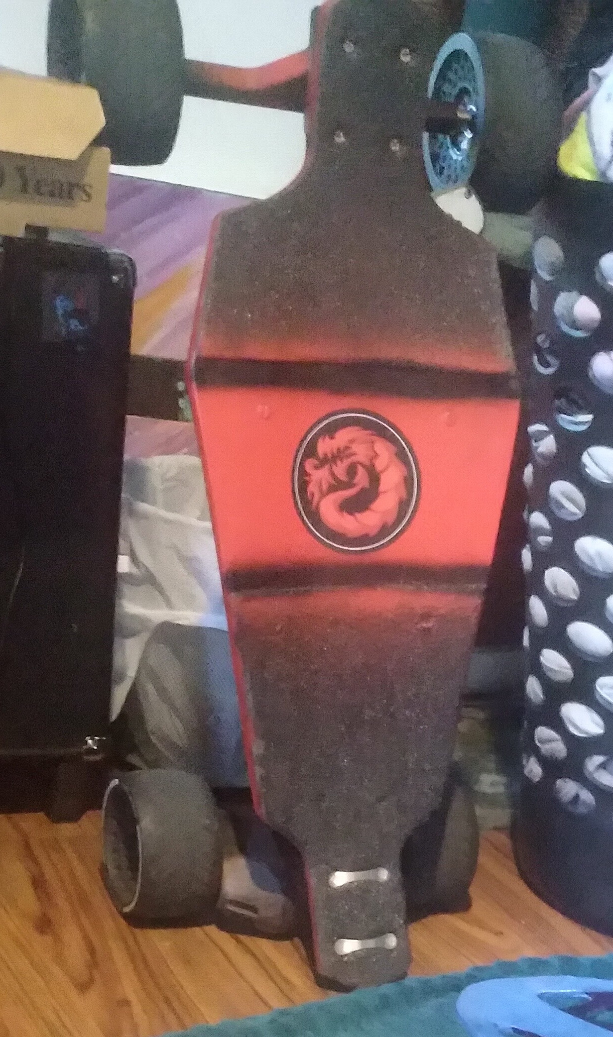 Oh thats my boosted board. Til the day something in it dies and I throw a gear drive on it. XD its still running boosted hardware so I figured you guys wouldn’t like it. One of a kind deck I had commissioned, 12 inch torqueboard front truck, 120mm flash airless wheels… backwards mounted g bomb bracket to mount motors backwards and be able to use the kicktail. Oh and it stands up either way. Here have a few more pics. Its pretty cool, but it really can’t handle those wheels range wise xD