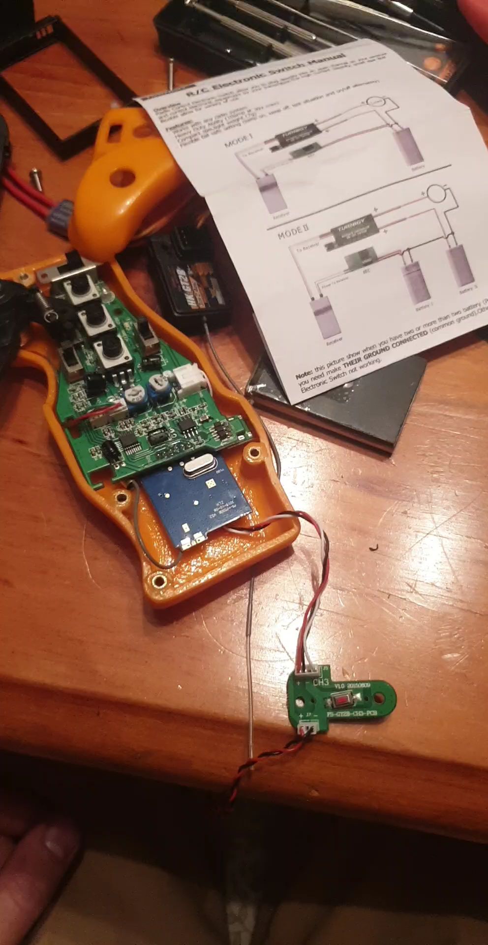 Next you want to solder your battery to your positive and negative, and solder an extra wire to hang off the battery side. This wire should go to one leg of your switch. the other leg of your switch should be the white signal wire coming from the main pcb. You want this circuit: